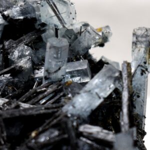 Aquamarine is the blue to green-blue gemstone variety of beryl. The name aquamarine comes from two Latin words aqua marinus meaning “water of the sea”. Aquamarine can be found growing within Siderite. This is a mineral of primarily iron carbonate and found in the Erongo Mountains of Namibia. It can also grow within Black Tourmaline and Feldspar.