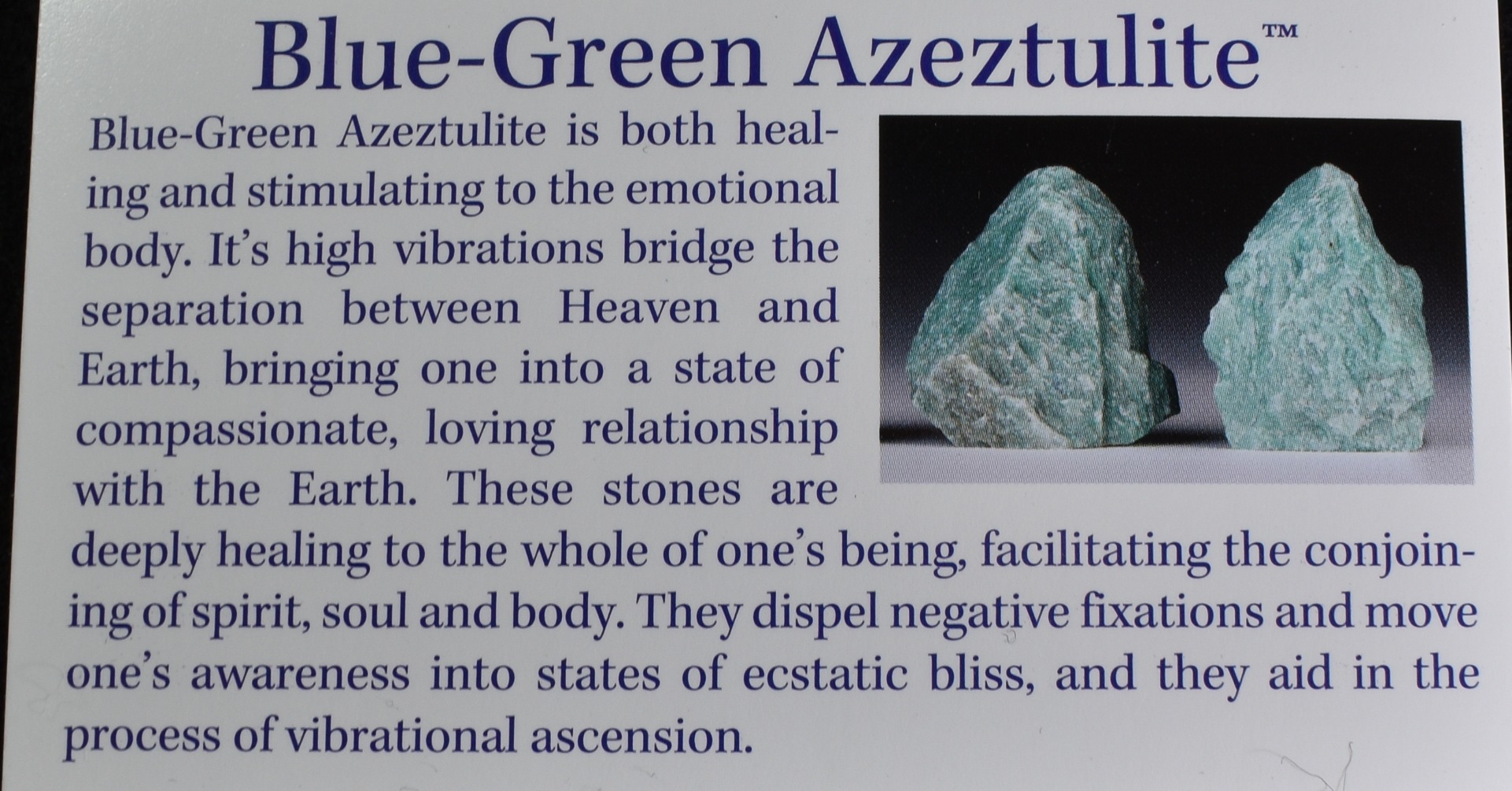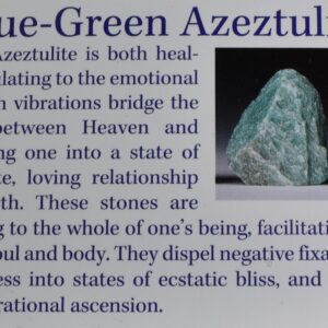 - Blue-Green Azeztulite is a high vibratin stone discovered in the USA’s pacific northwest. It is a silicon dioxide mineral with it’s colour from copper compounds within the stones