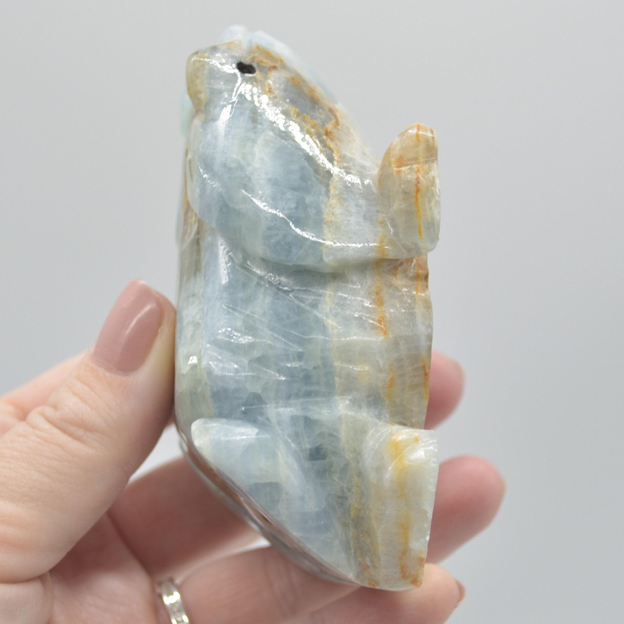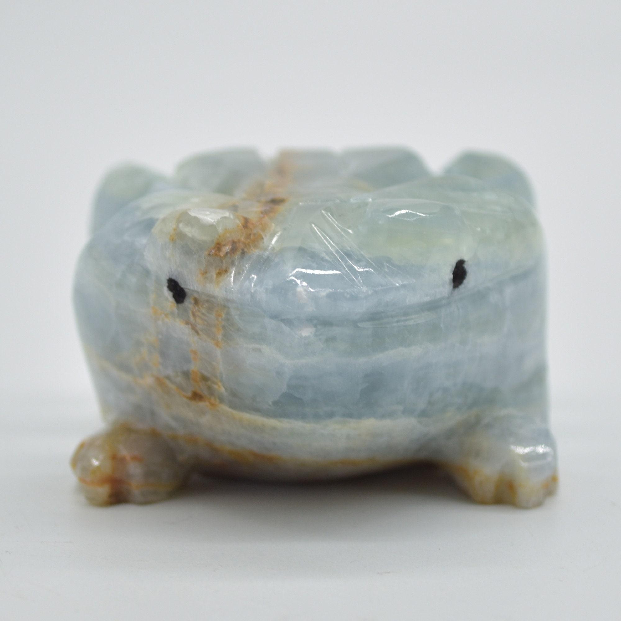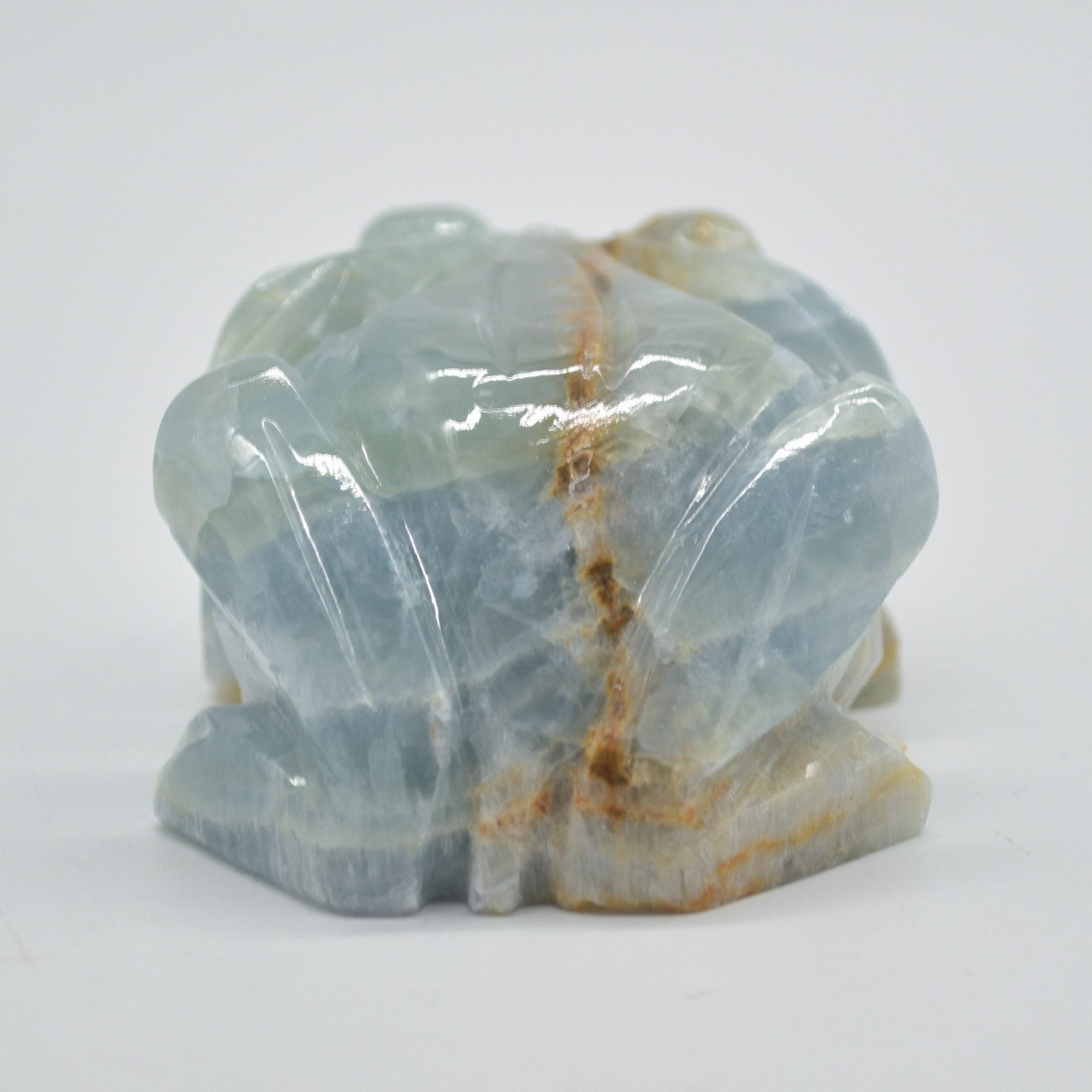 Natural polished Blue Onyx (Lemurian Aquatine Calcite) crystal carved Frog / Toad