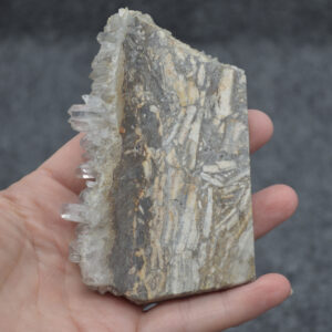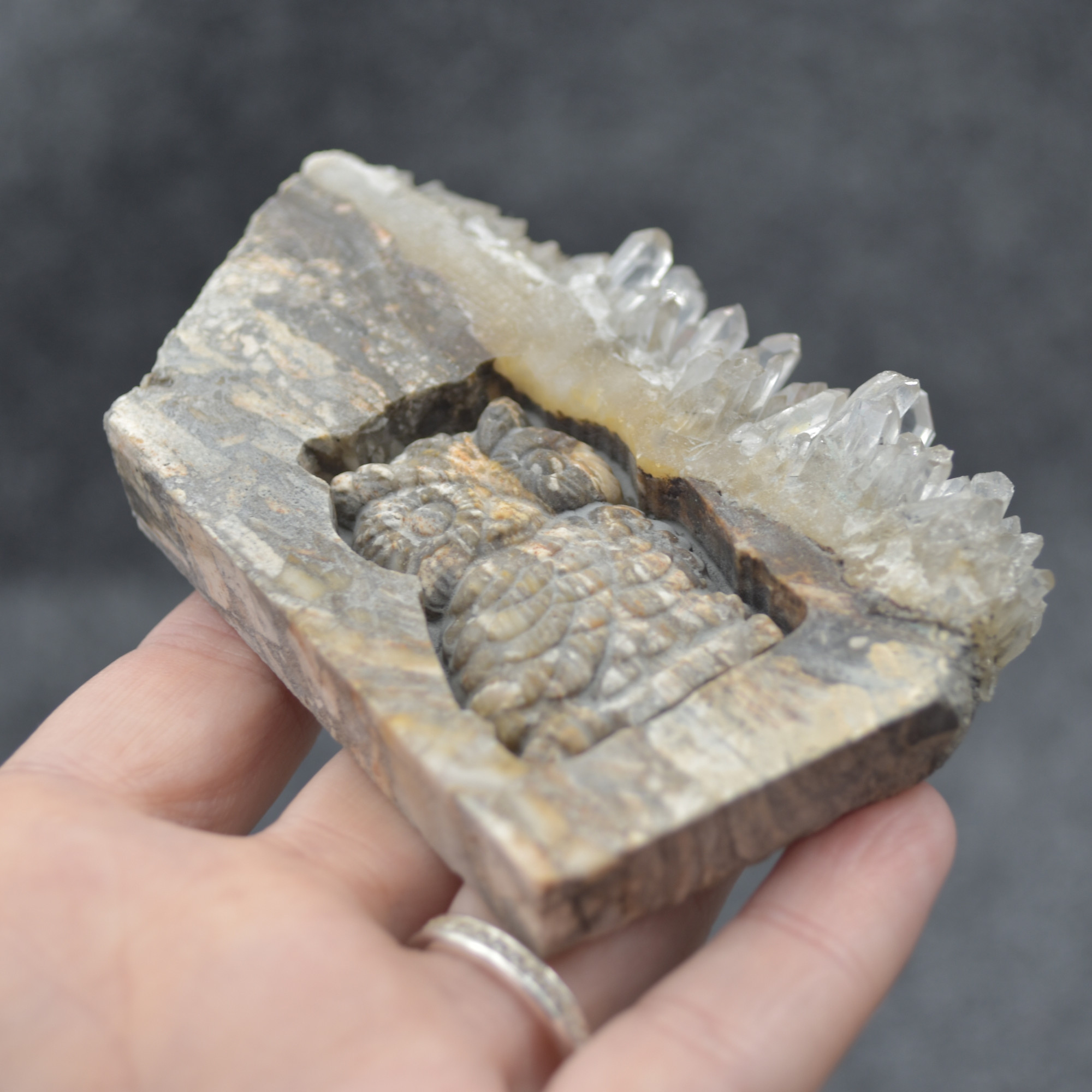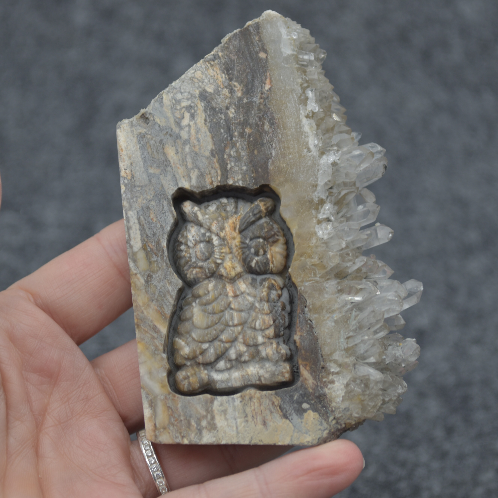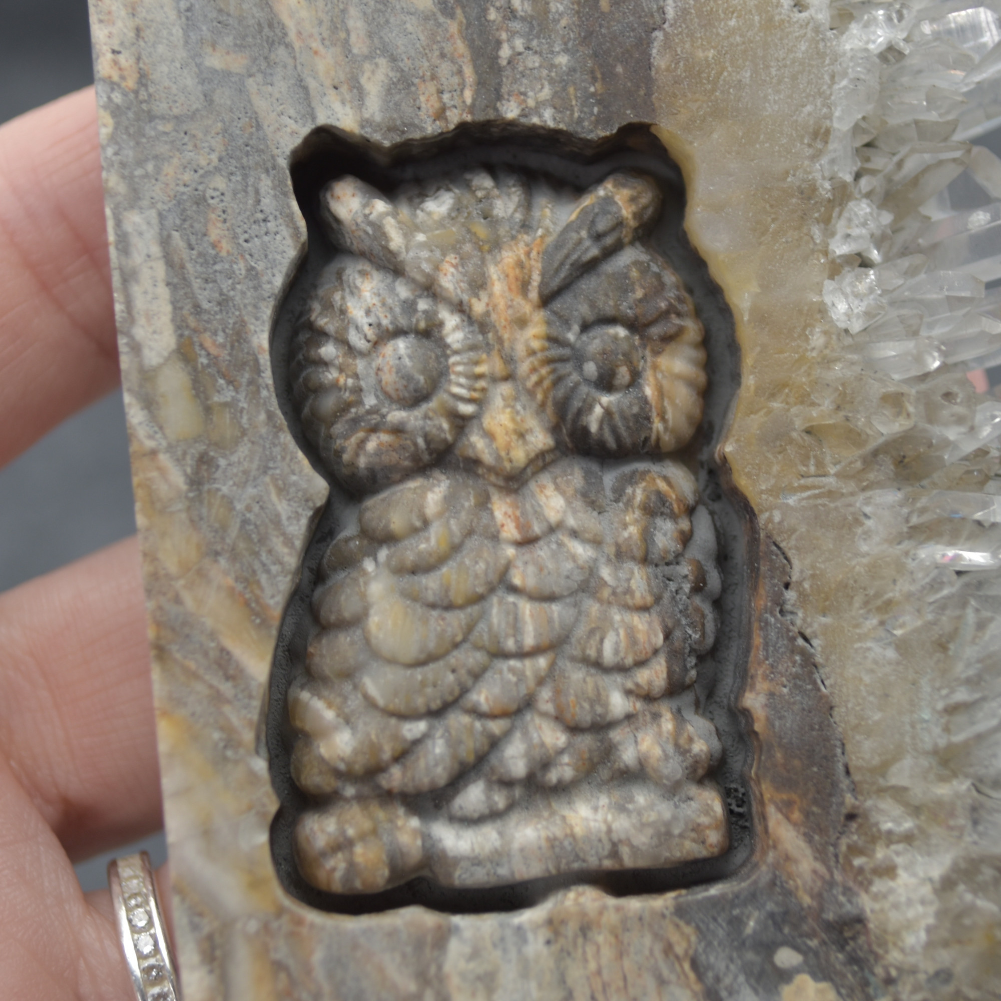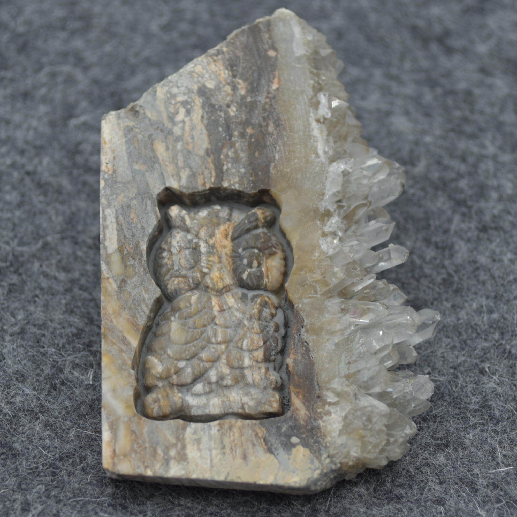 Natural Raw Crystal Quartz Cluster Slice with hand carved Owl