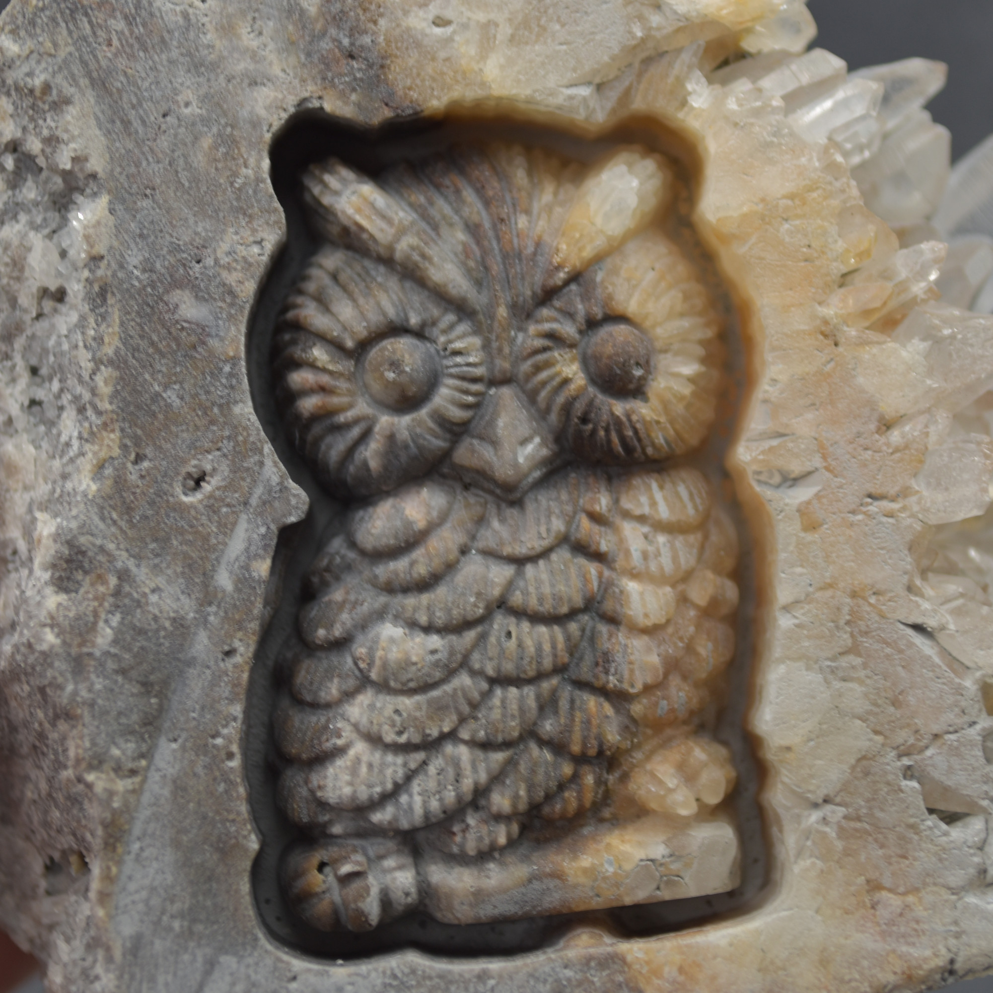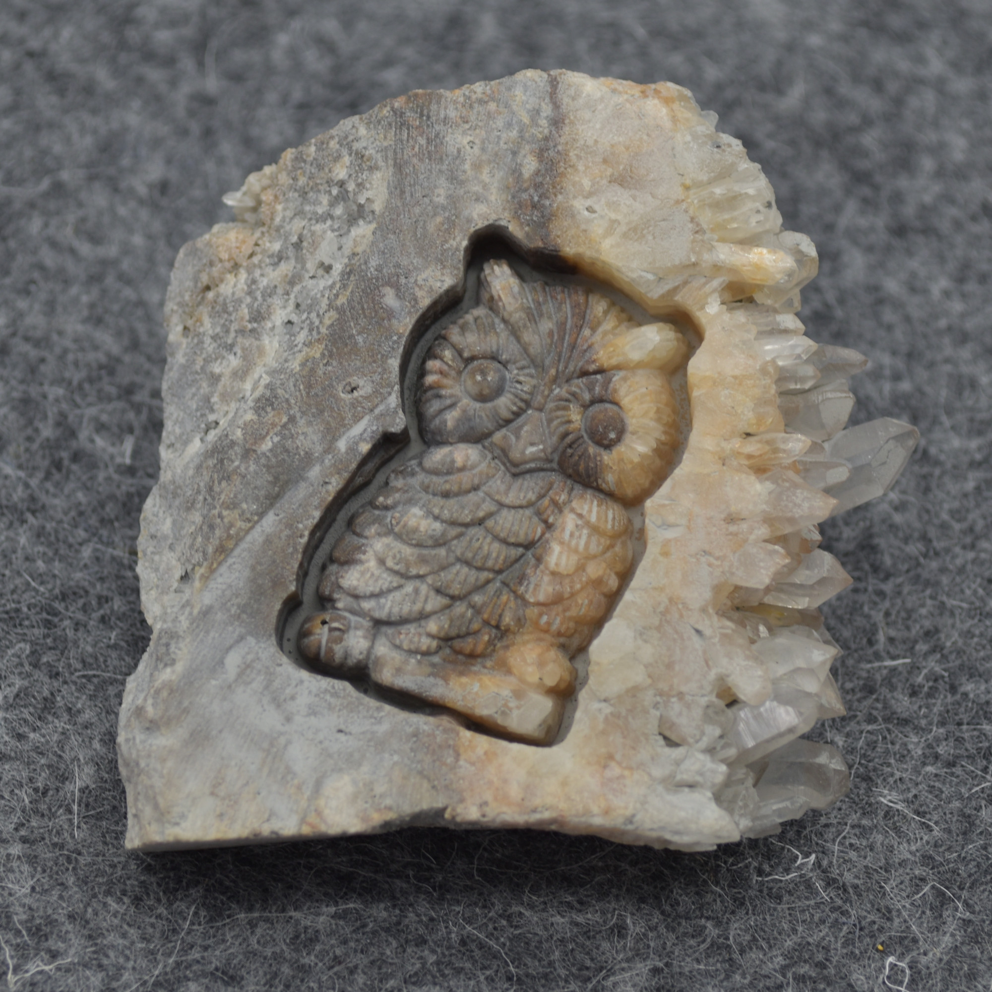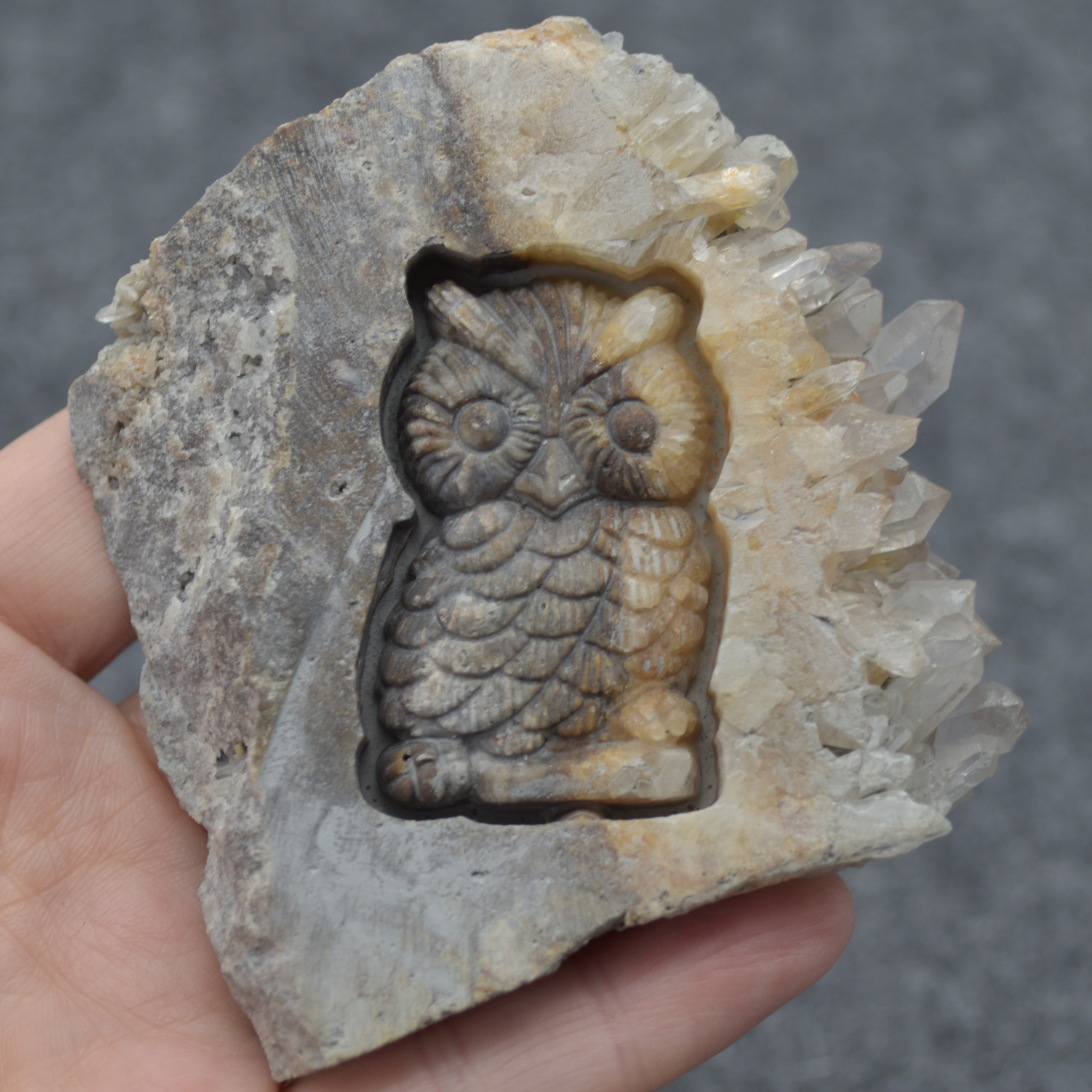 Natural Raw Crystal Quartz Cluster Slice with hand carved Owl