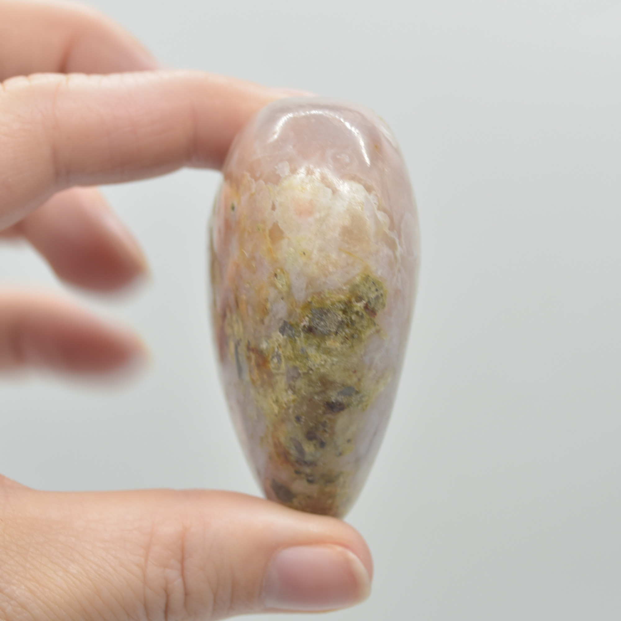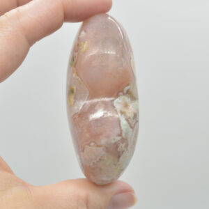 Flower Agate is a type of Agate with opaque Chalcedony inclusions that resemble tiny floral formations. This mineral is a recent find out of Madagascar and has only been seen crystallized in the form of masses. It’s usually found in a light pink colour with white “flower” inclusions.