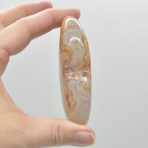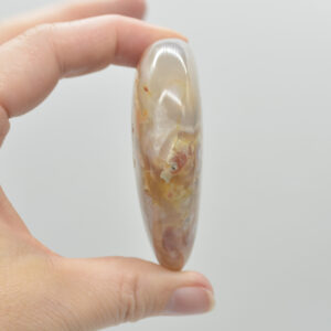 Flower Agate is a type of Agate with opaque Chalcedony inclusions that resemble tiny floral formations. This mineral is a recent find out of Madagascar and has only been seen crystallized in the form of masses. It’s usually found in a light pink colour with white “flower” inclusions.
