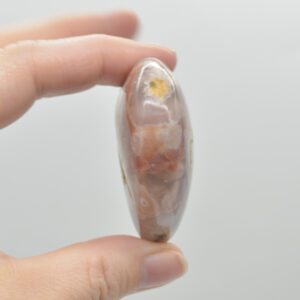 Flower Agate is a type of Agate with opaque Chalcedony inclusions that resemble tiny floral formations. This mineral is a recent find out of Madagascar and has only been seen crystallized in the form of masses. It’s usually found in a light pink colour with white “flower” inclusions.