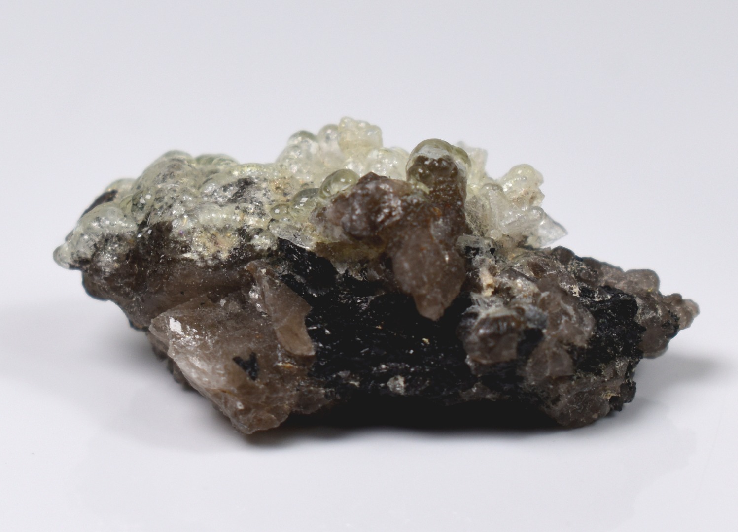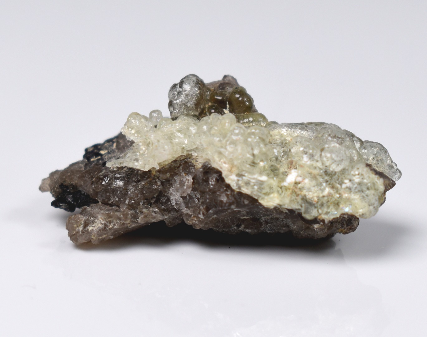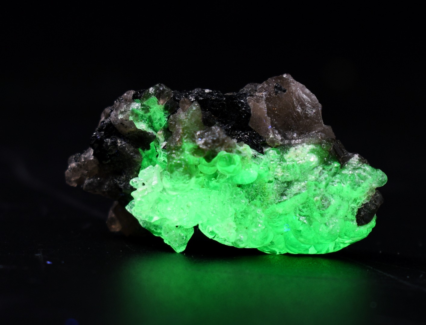 Fluorescent Hyalite Opal Crystal Specimen with Smoky Quartz and Black Tourmaline