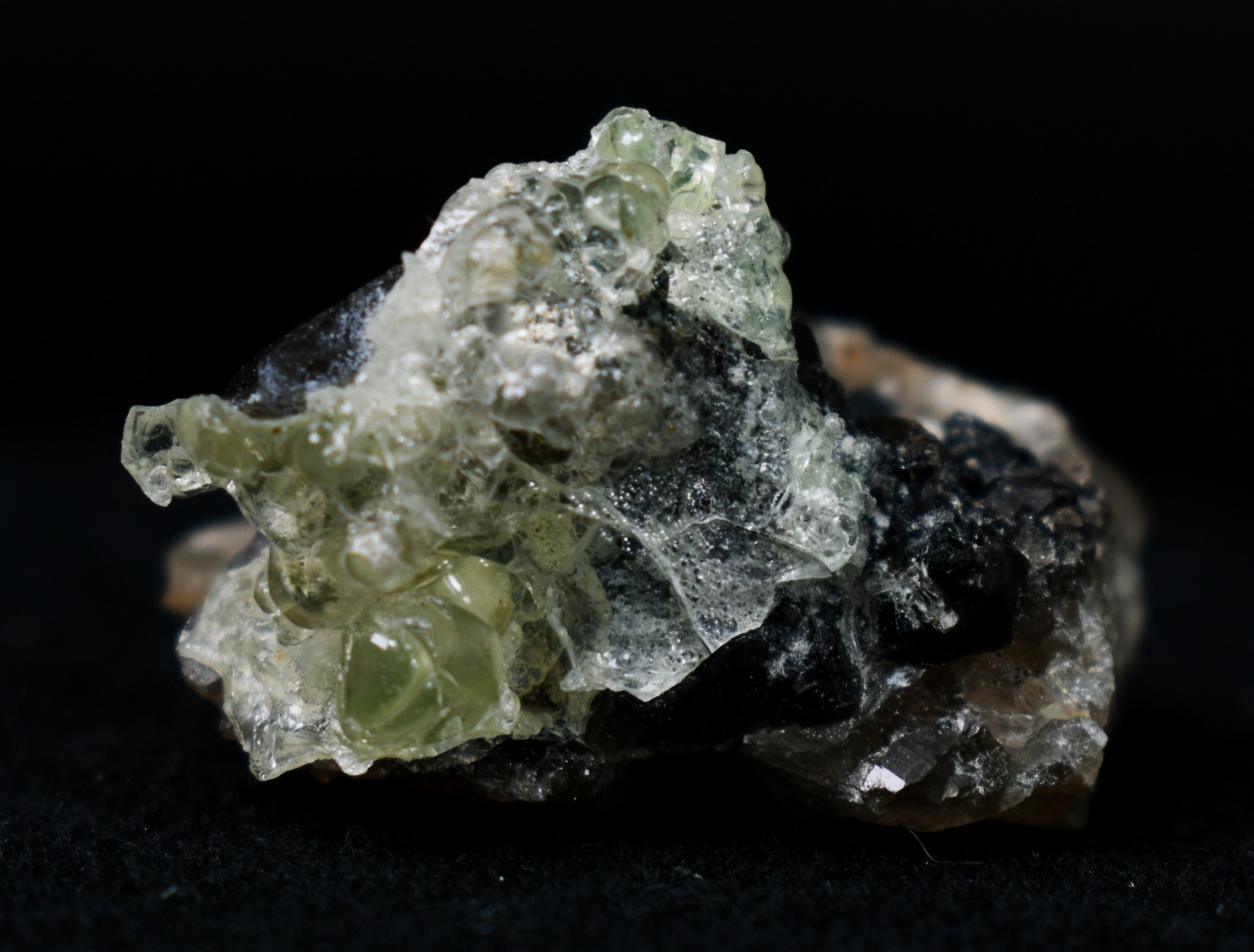 Fluorescent Hyalite Opal Crystal Specimen with Smoky Quartz and Black Tourmaline