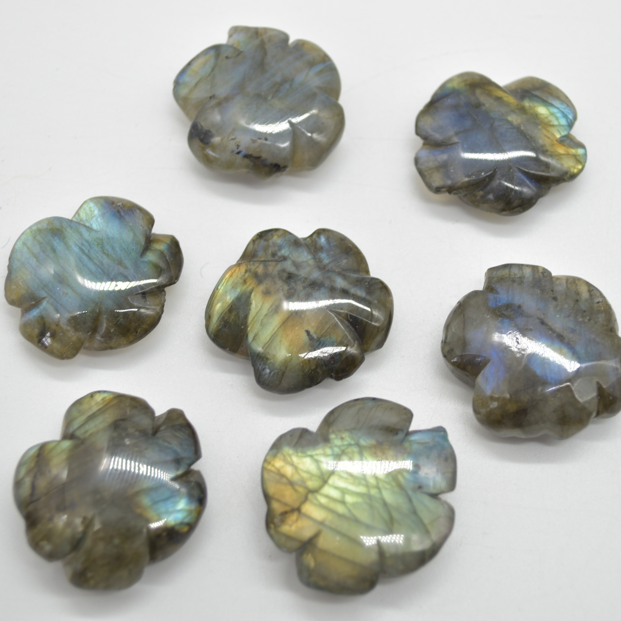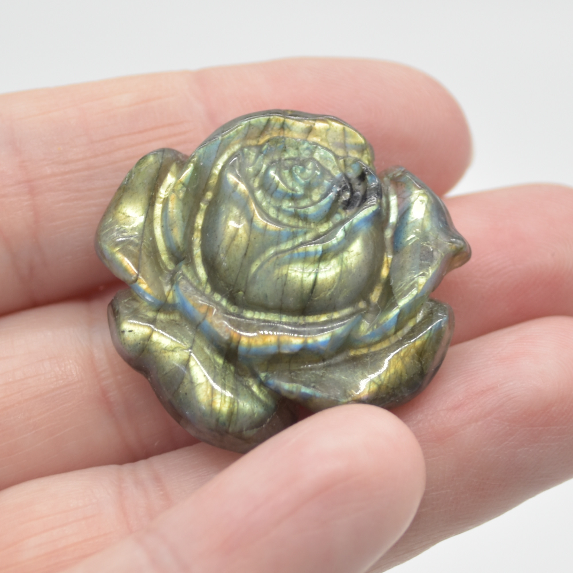 Natural Polished Labradorite Gemstone carved small rose flower with stunning blue, green and orange iridescent hues