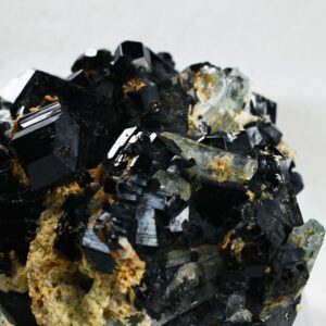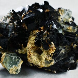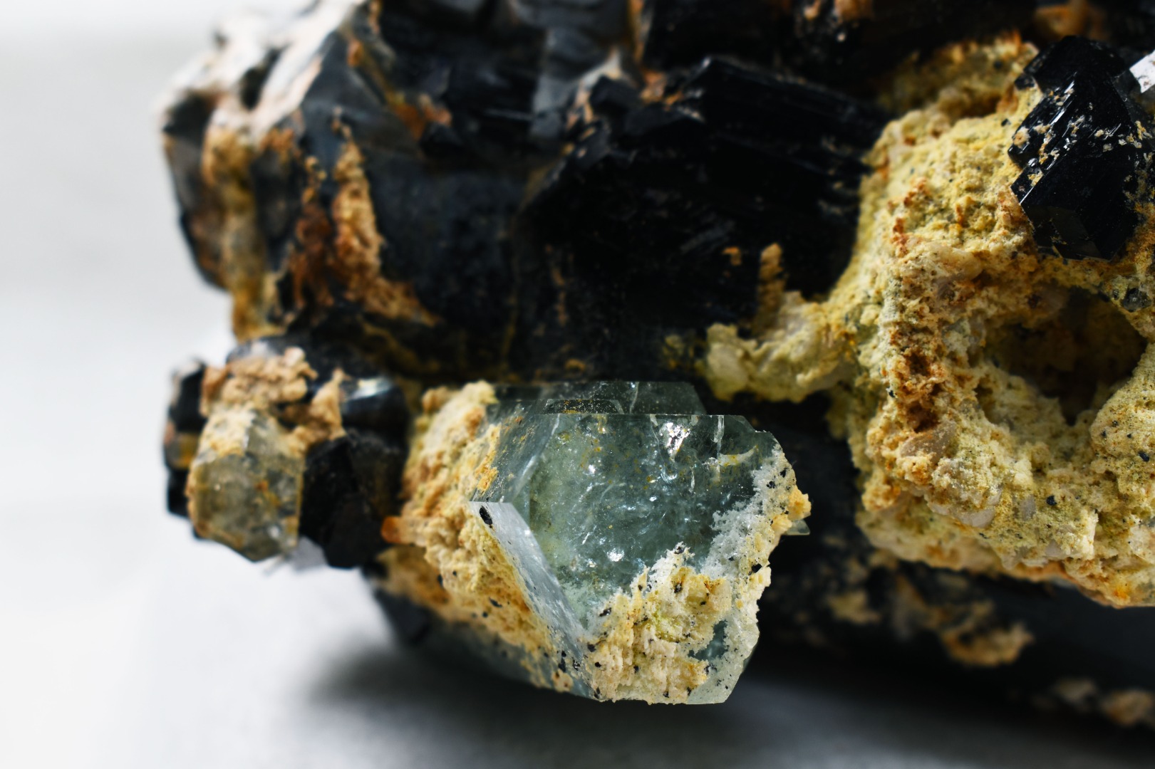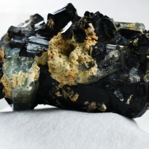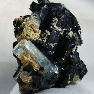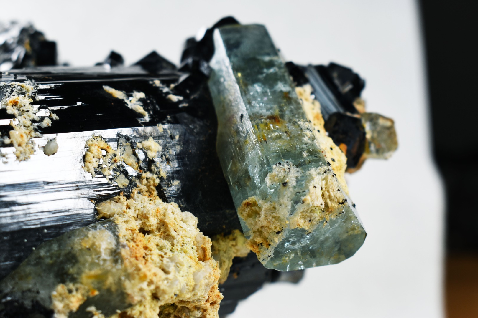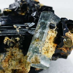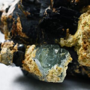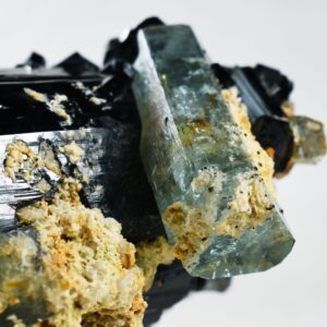 Aquamarine is the blue to green-blue gemstone variety of beryl. The name aquamarine comes from two Latin words aqua marinus meaning “water of the sea”. Aquamarine can be found growing within Siderite. This is a mineral of primarily iron carbonate and found in the Erongo Mountains of Namibia. It can also grow within Black Tourmaline and Feldspar.