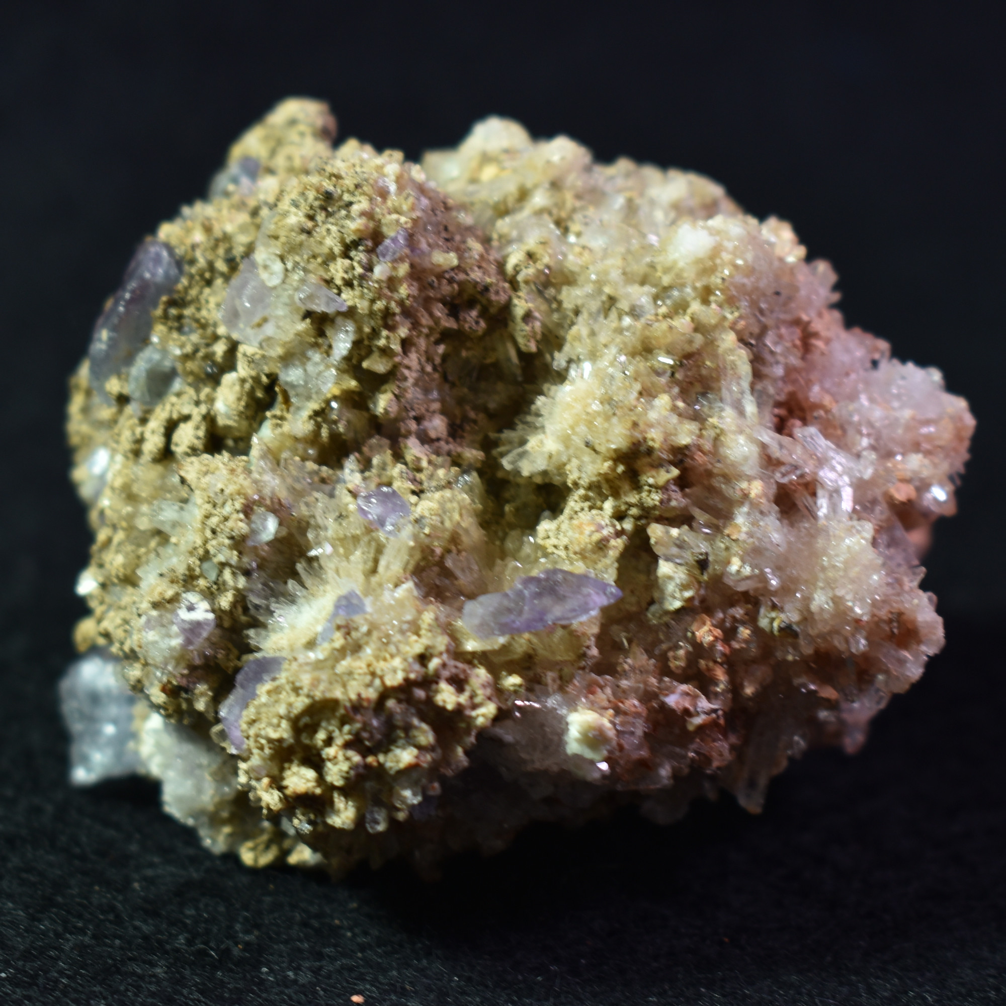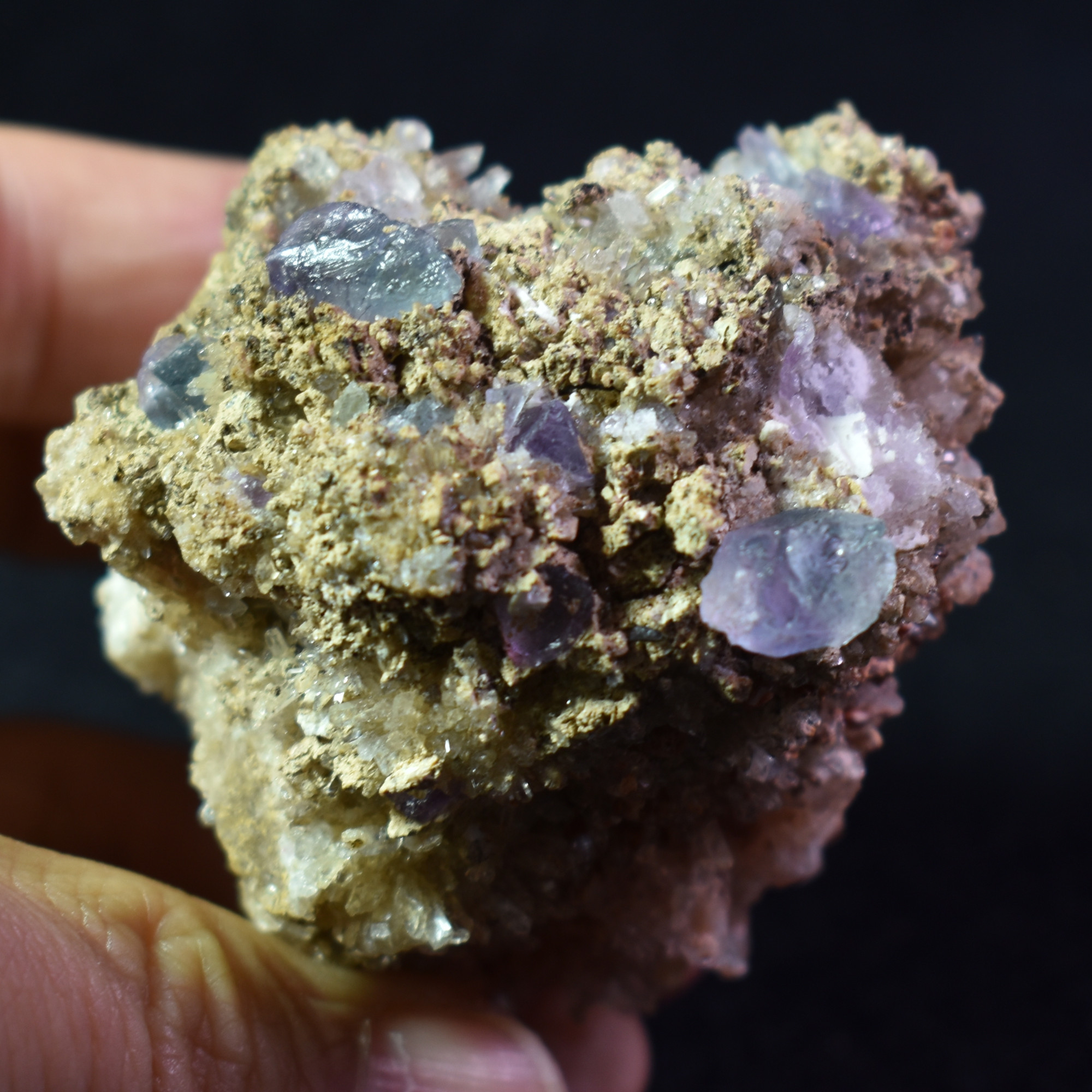 Adding highlights to the specimen are several part-crystals of Fluorite