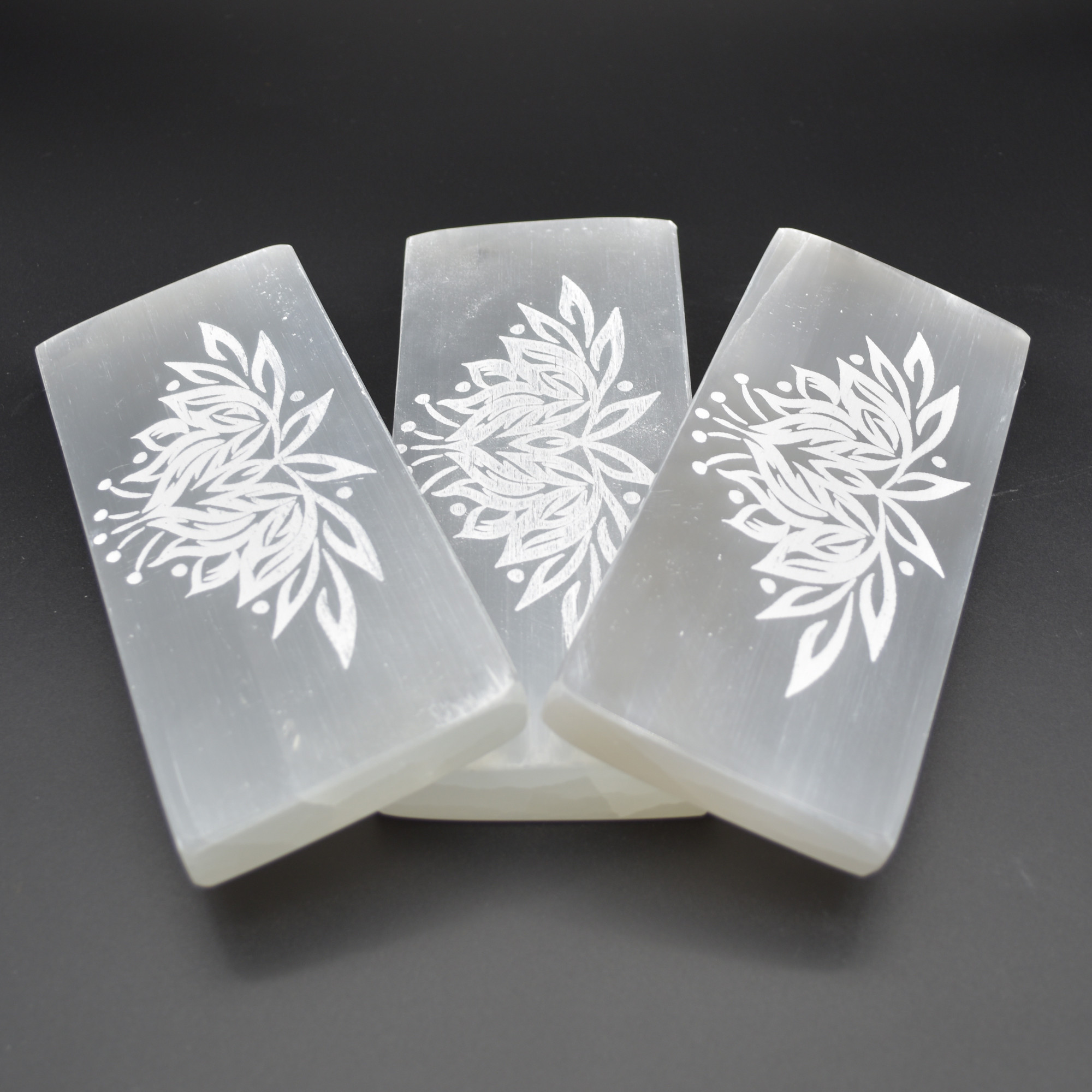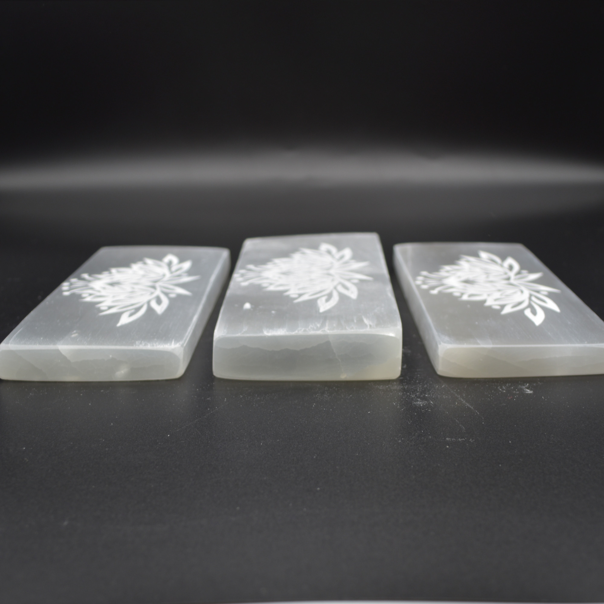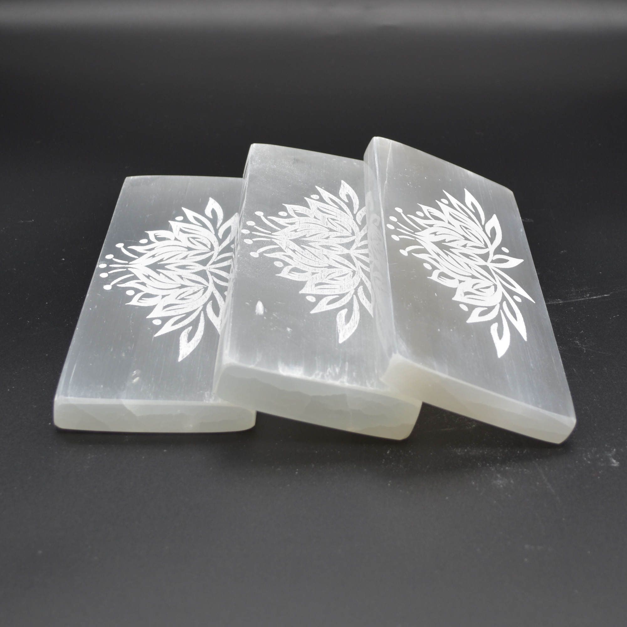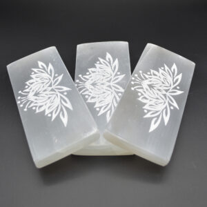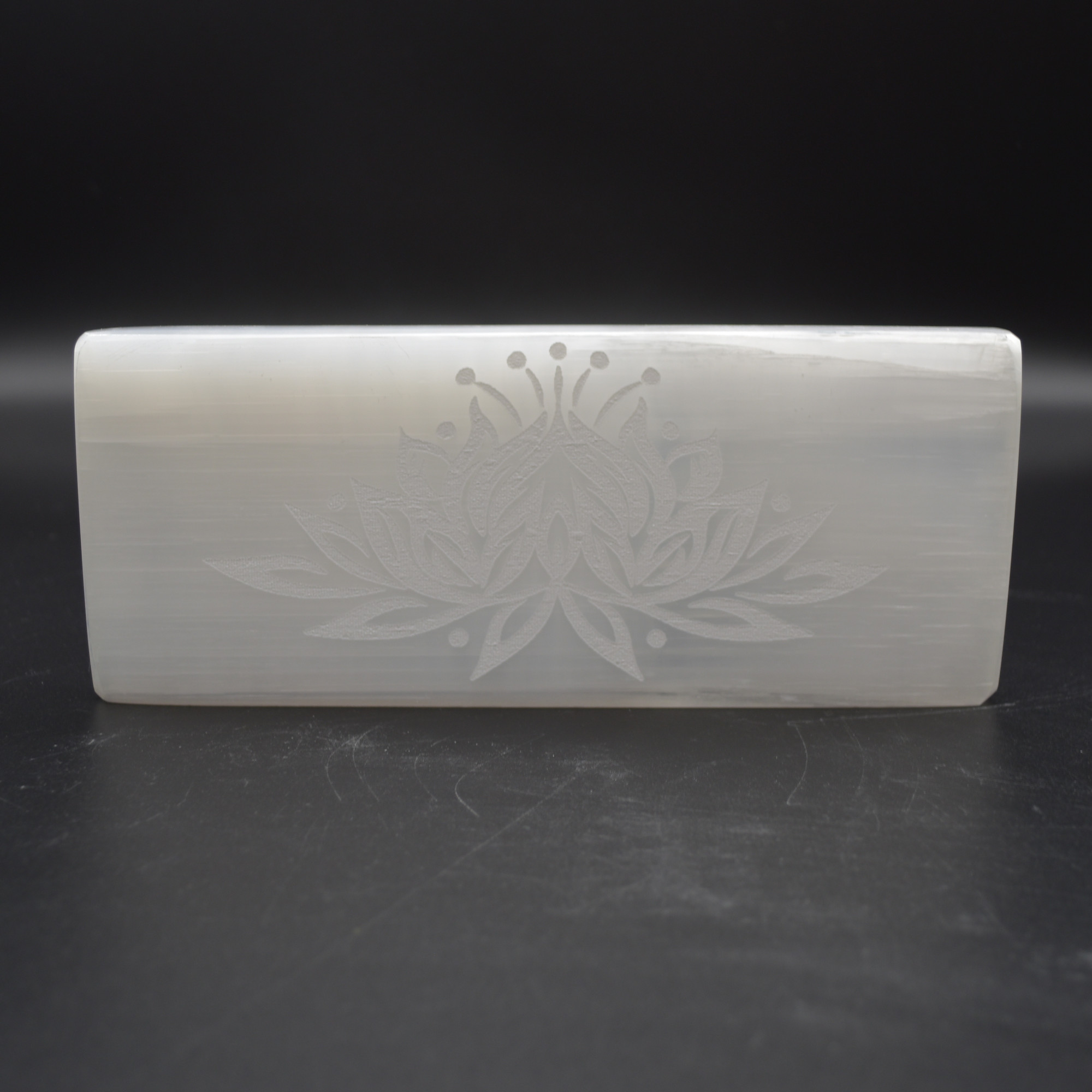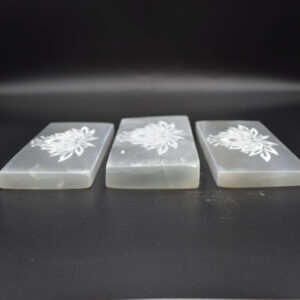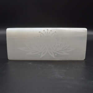 Natural Polished Satin Spar (Selenite) Carved Semi-precious Gemstone Rectangular Plate / Slab engraved with Lotus Flower Pattern