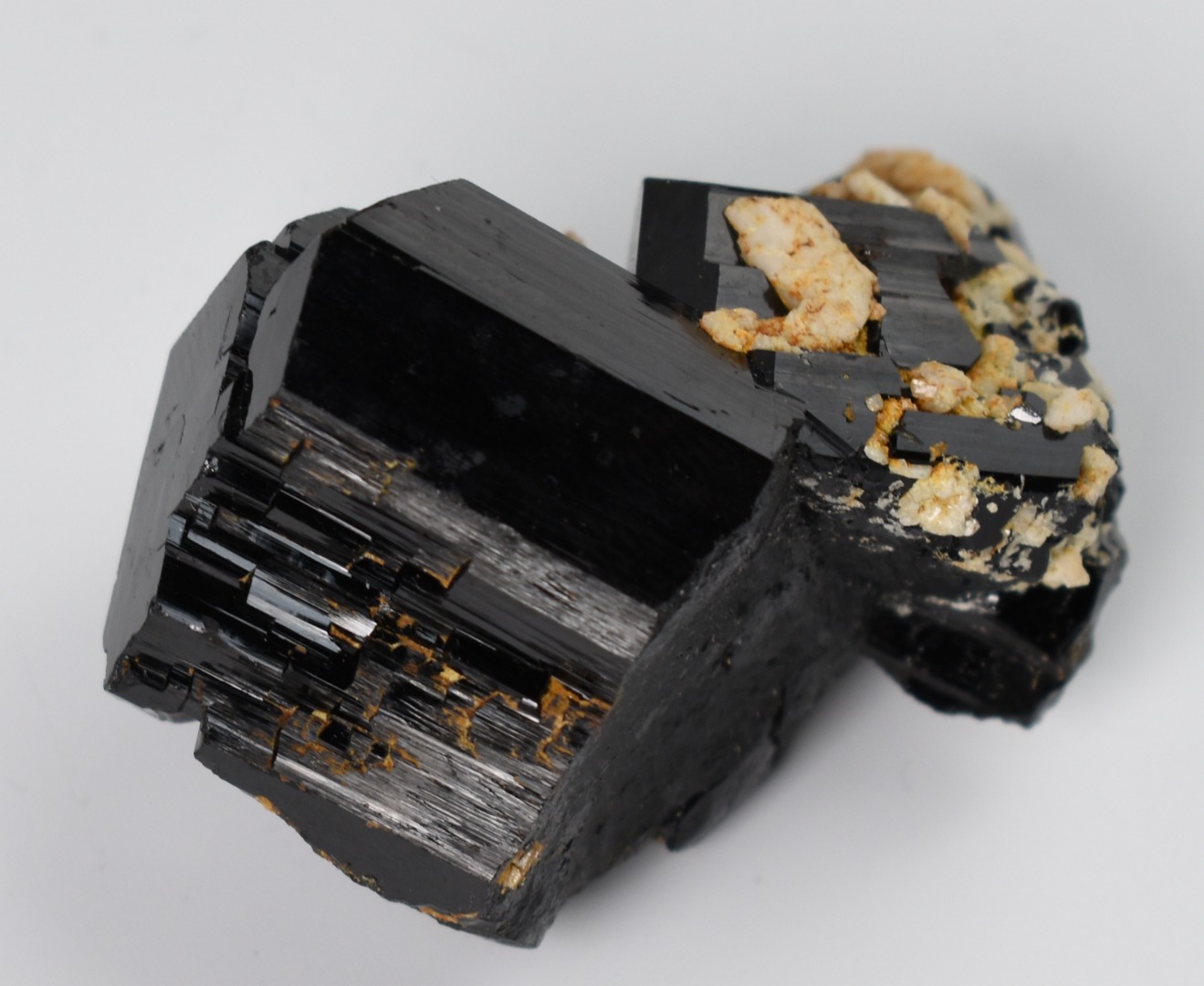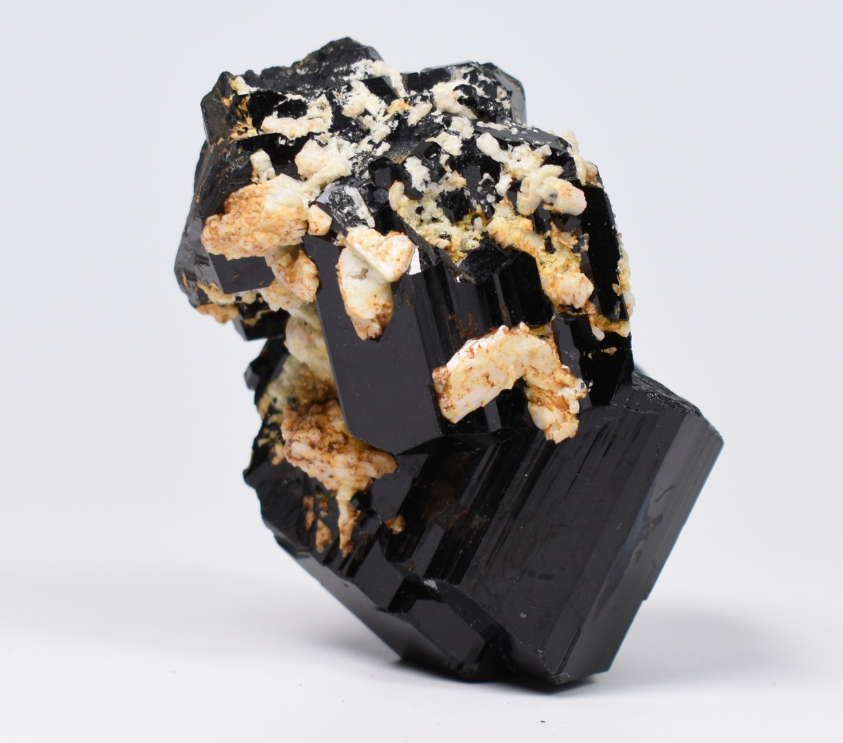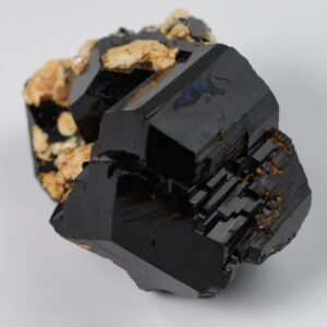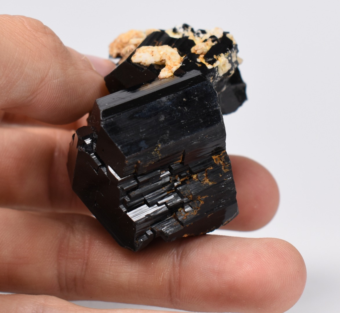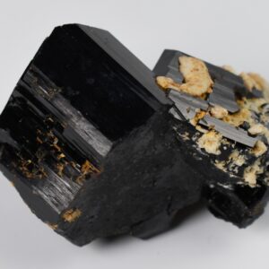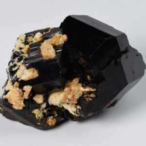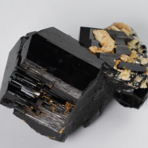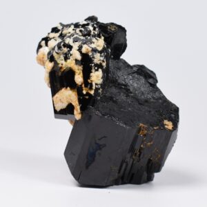 Discover the raw grounding energy of Black Tourmaline (Schorl). These stunning mineral specimens feature jet-black highly lustrous Tourmaline crystals many of which are naturally embedded in a contrasting creamy Feldspar matrix.