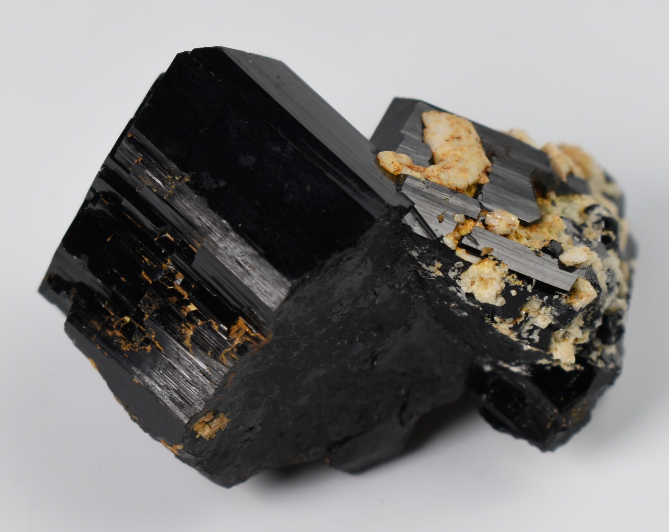 These are not tumbled stones; they are raw natural specimens showing distinct vertical striations and natural termination points. The juxtaposition of the deep black crystal against the light mineral matrix creates a striking visual piece perfect for any mineral collection altar or home decor.