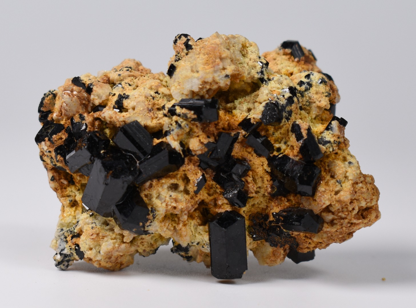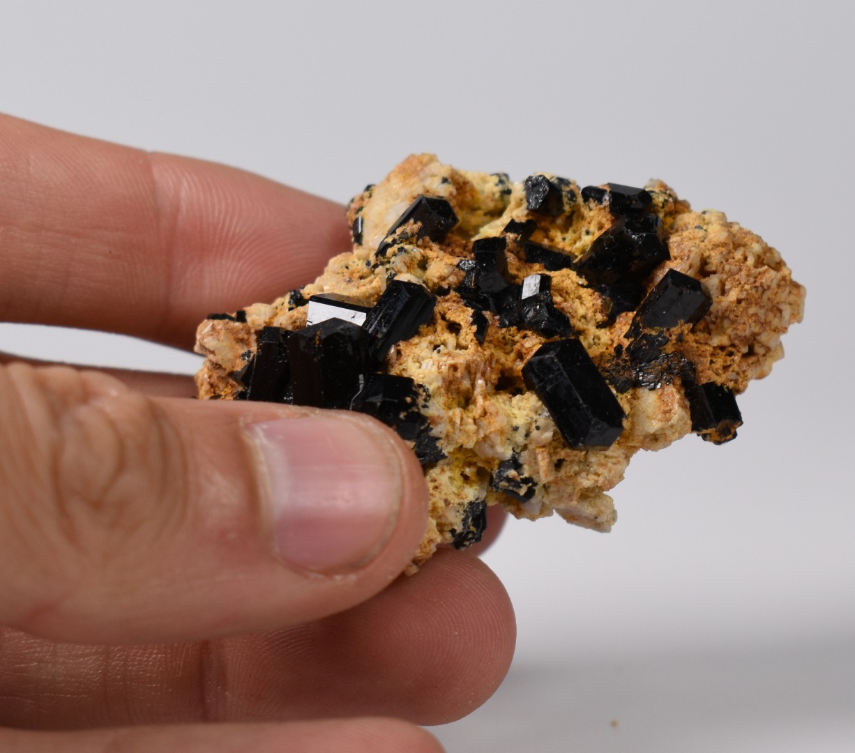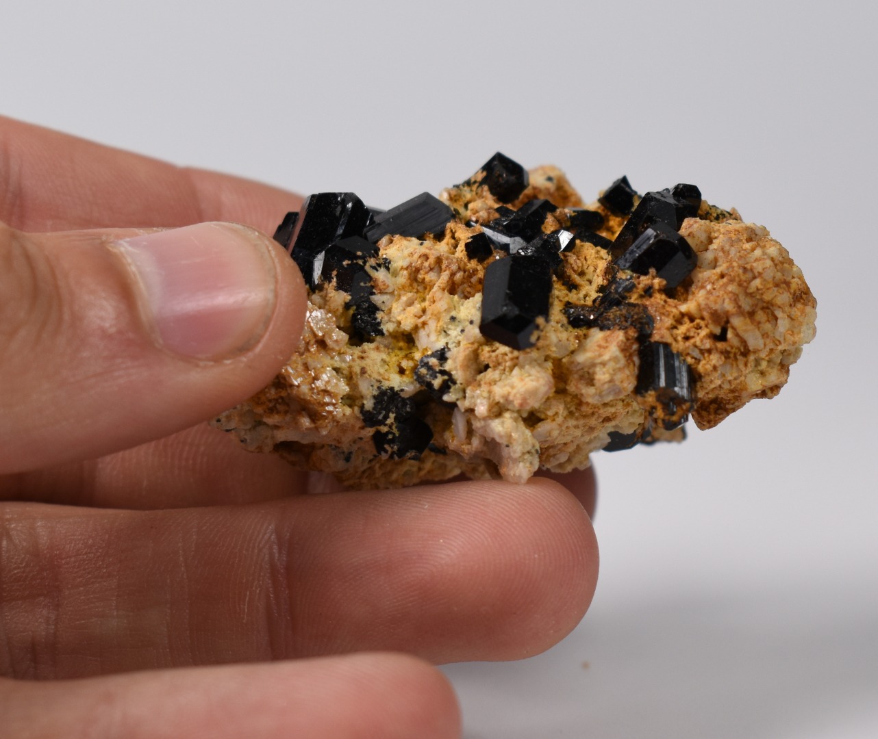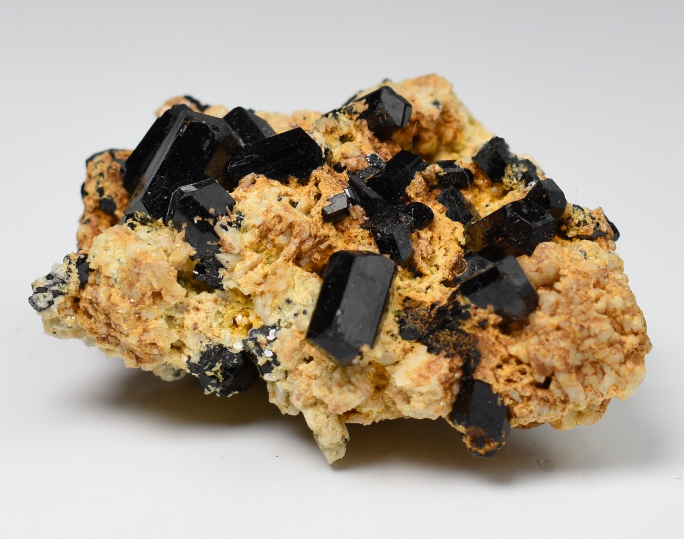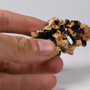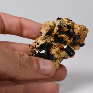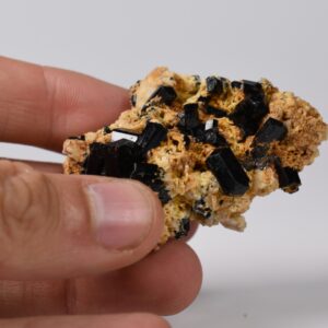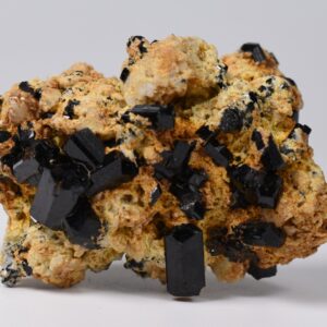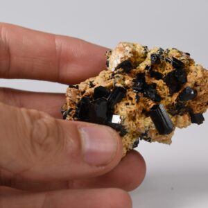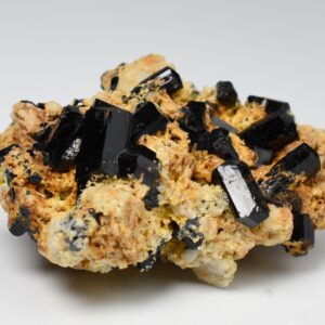 Discover the raw grounding energy of Black Tourmaline (Schorl). These stunning mineral specimens feature jet-black highly lustrous Tourmaline crystals many of which are naturally embedded in a contrasting creamy Feldspar matrix.