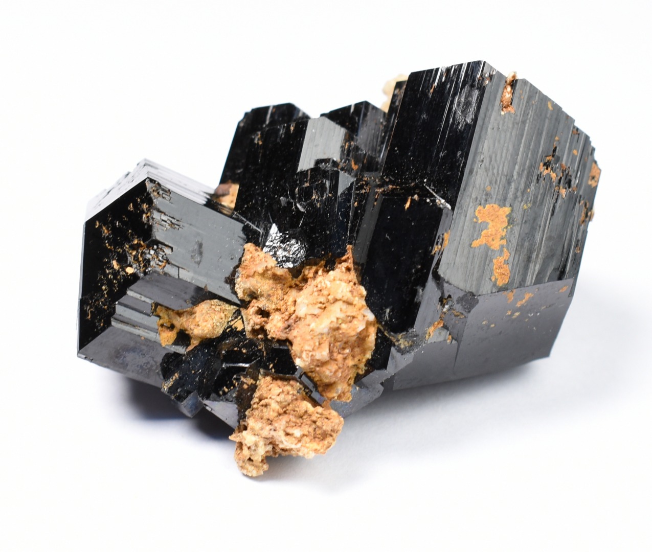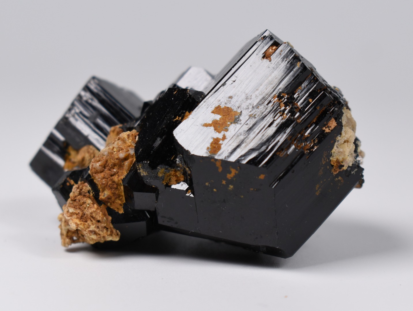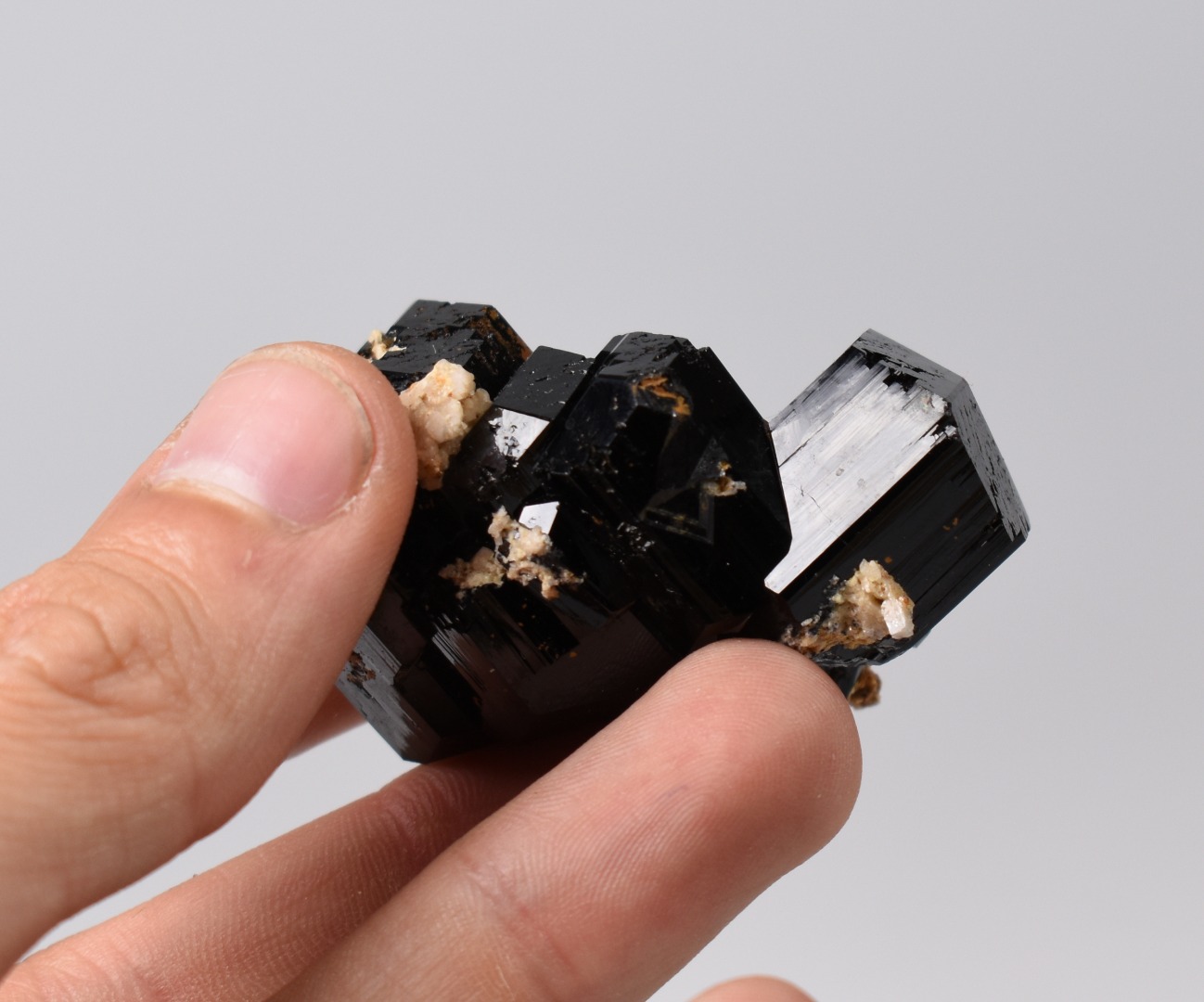 These are not tumbled stones; they are raw natural specimens showing distinct vertical striations and natural termination points. The juxtaposition of the deep black crystal against the light mineral matrix creates a striking visual piece perfect for any mineral collection altar or home decor.