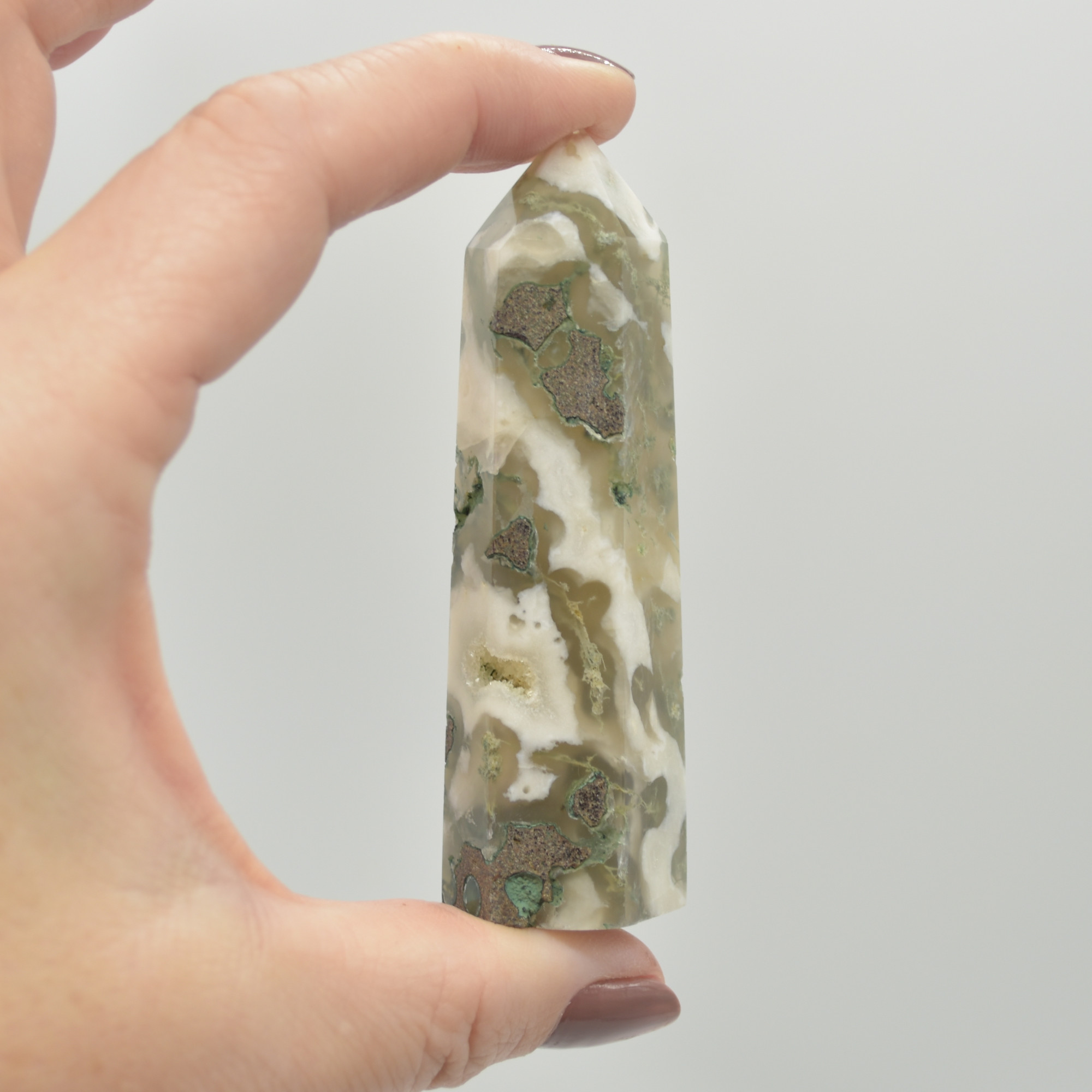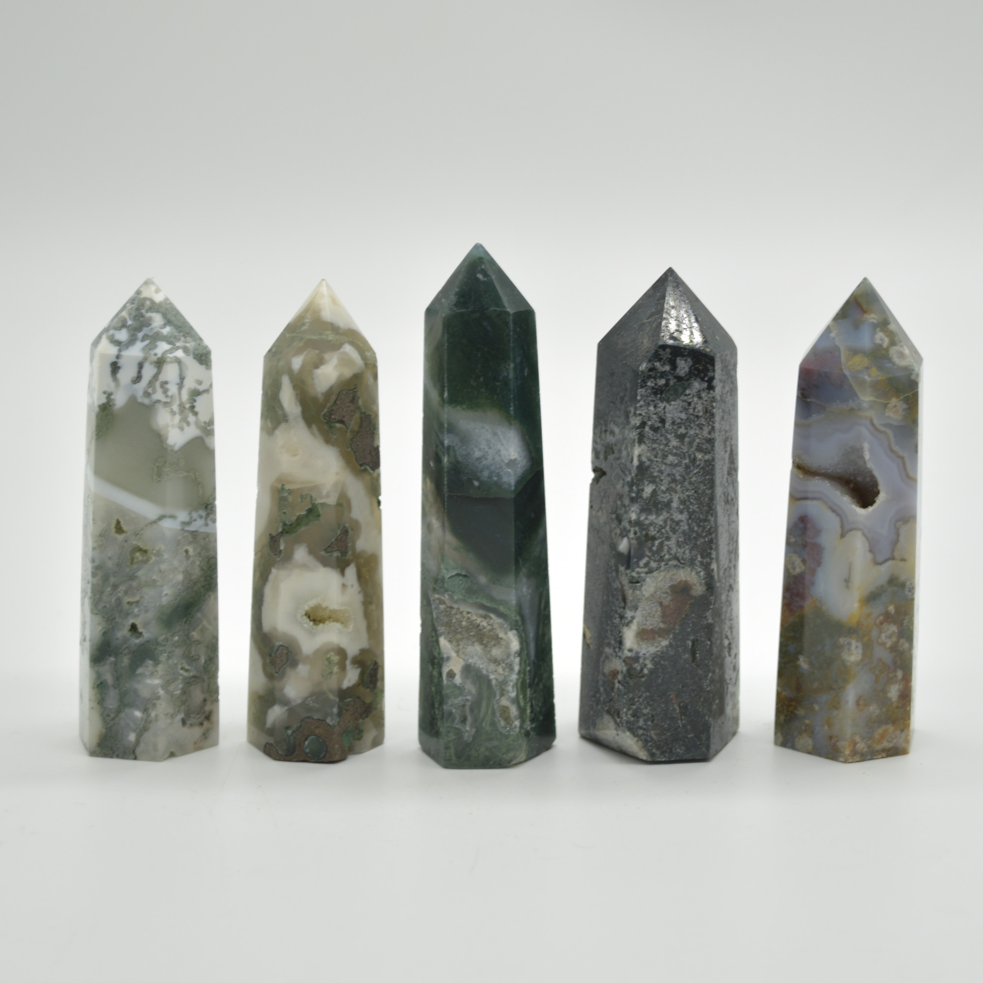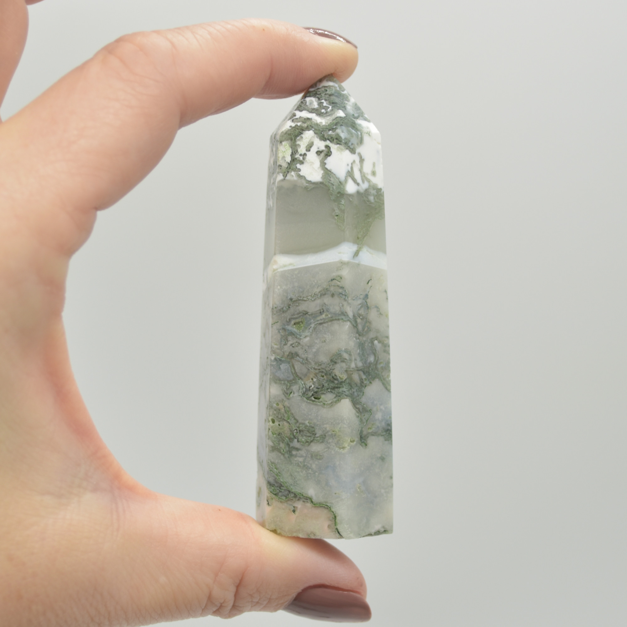 Moss Agate Point, Tower, Wand – 8cm – 9cm – 1 Count