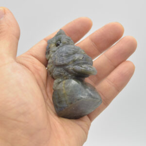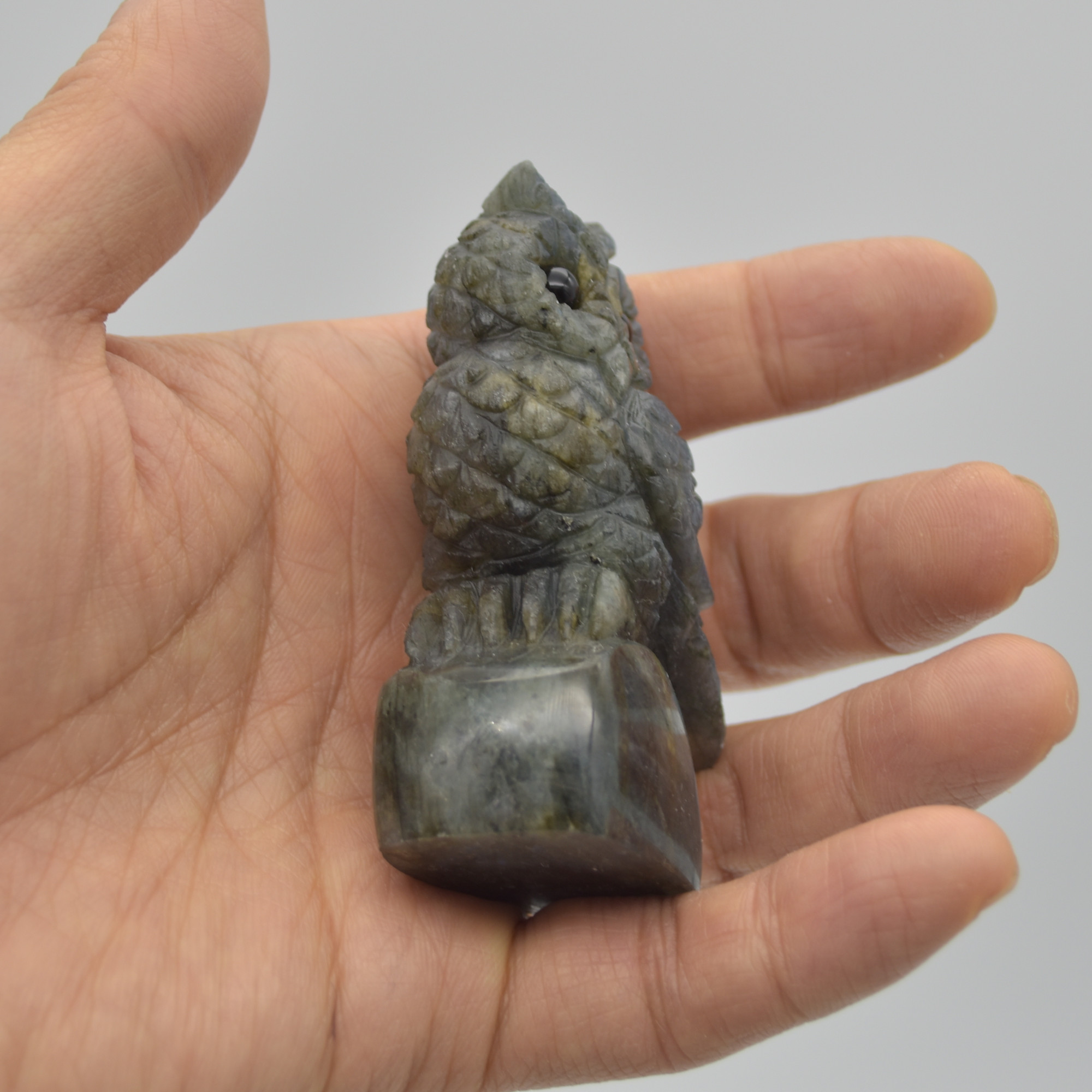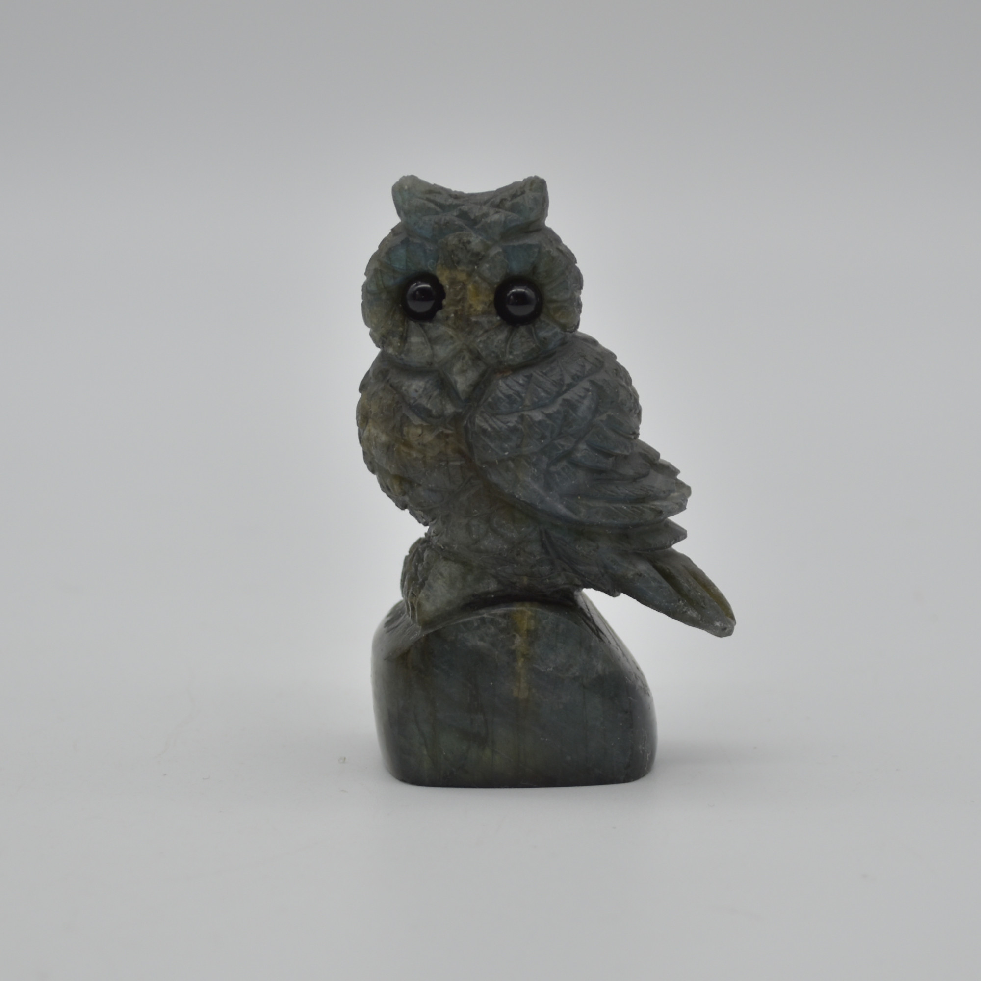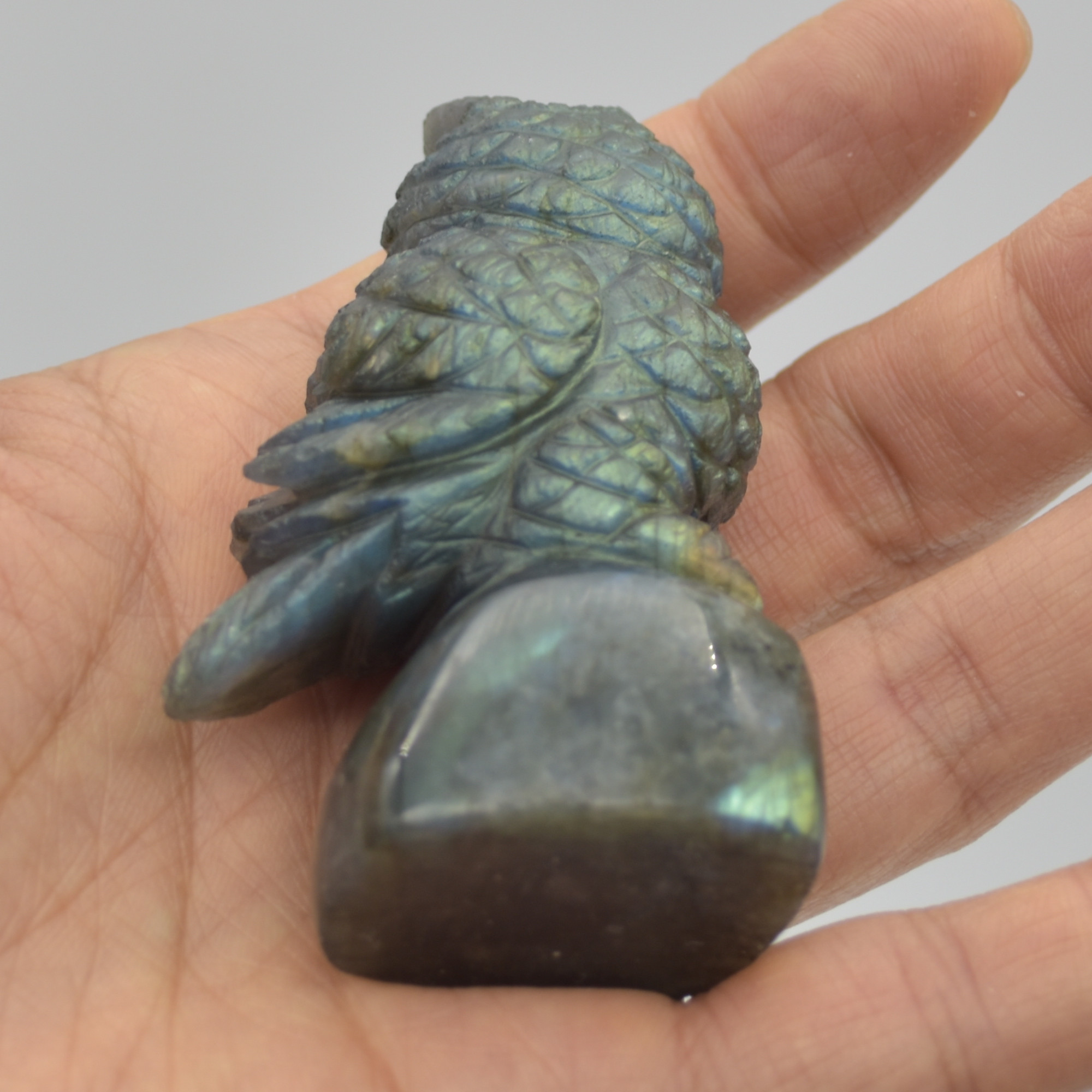 Labradorite carved owl with stunning blue and green iridescent hues