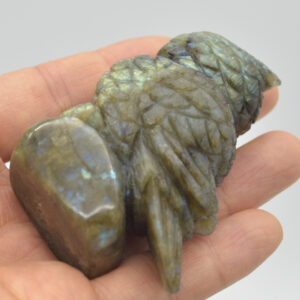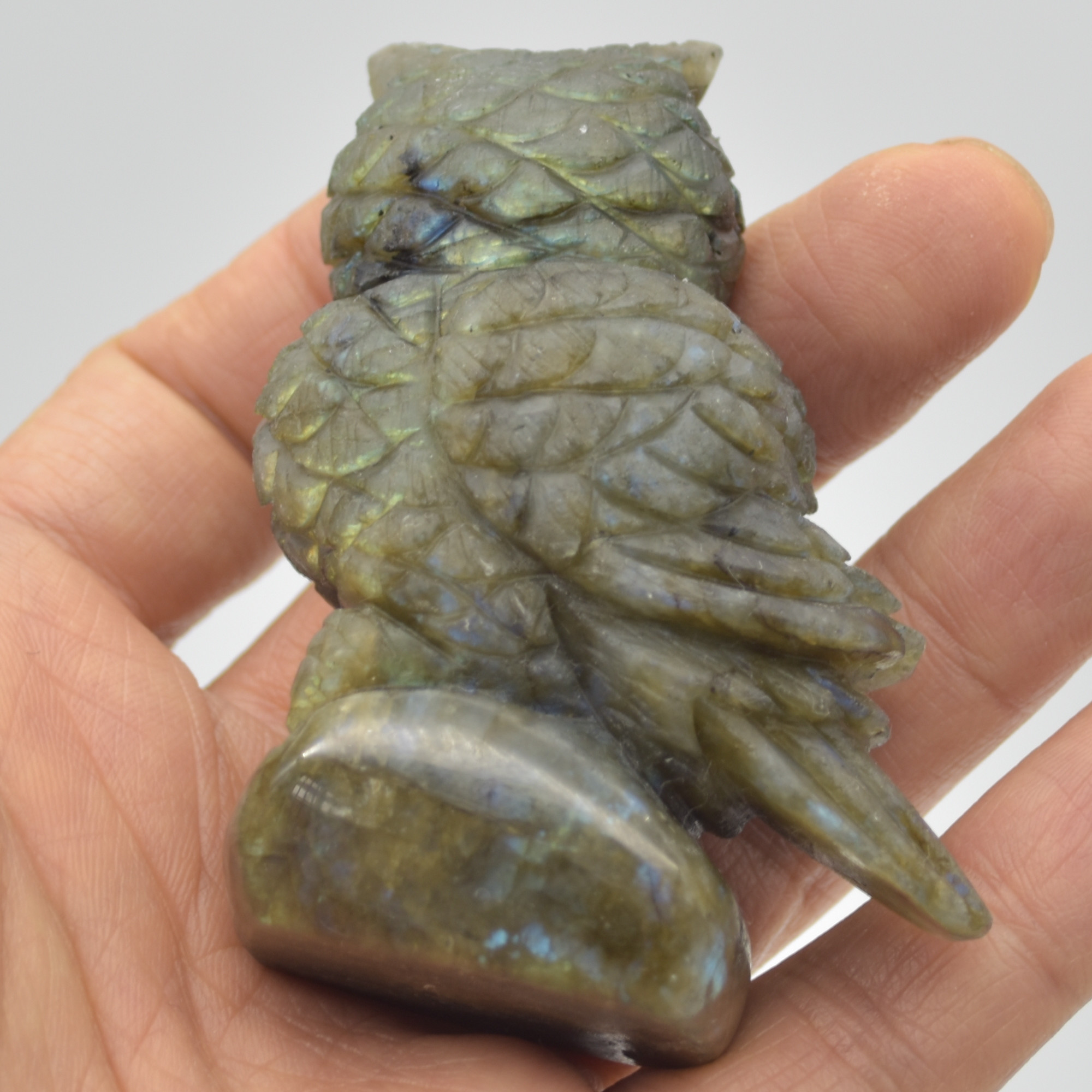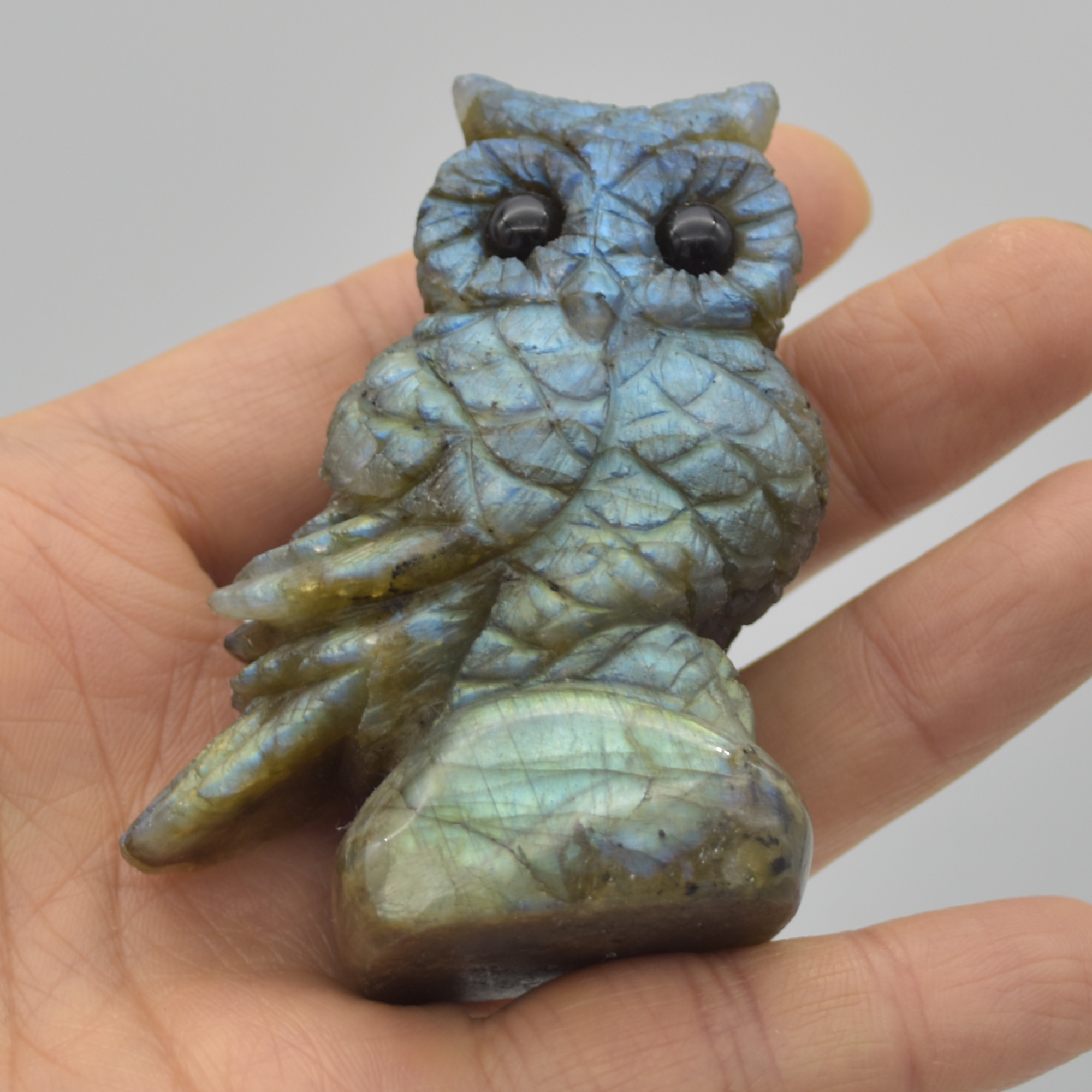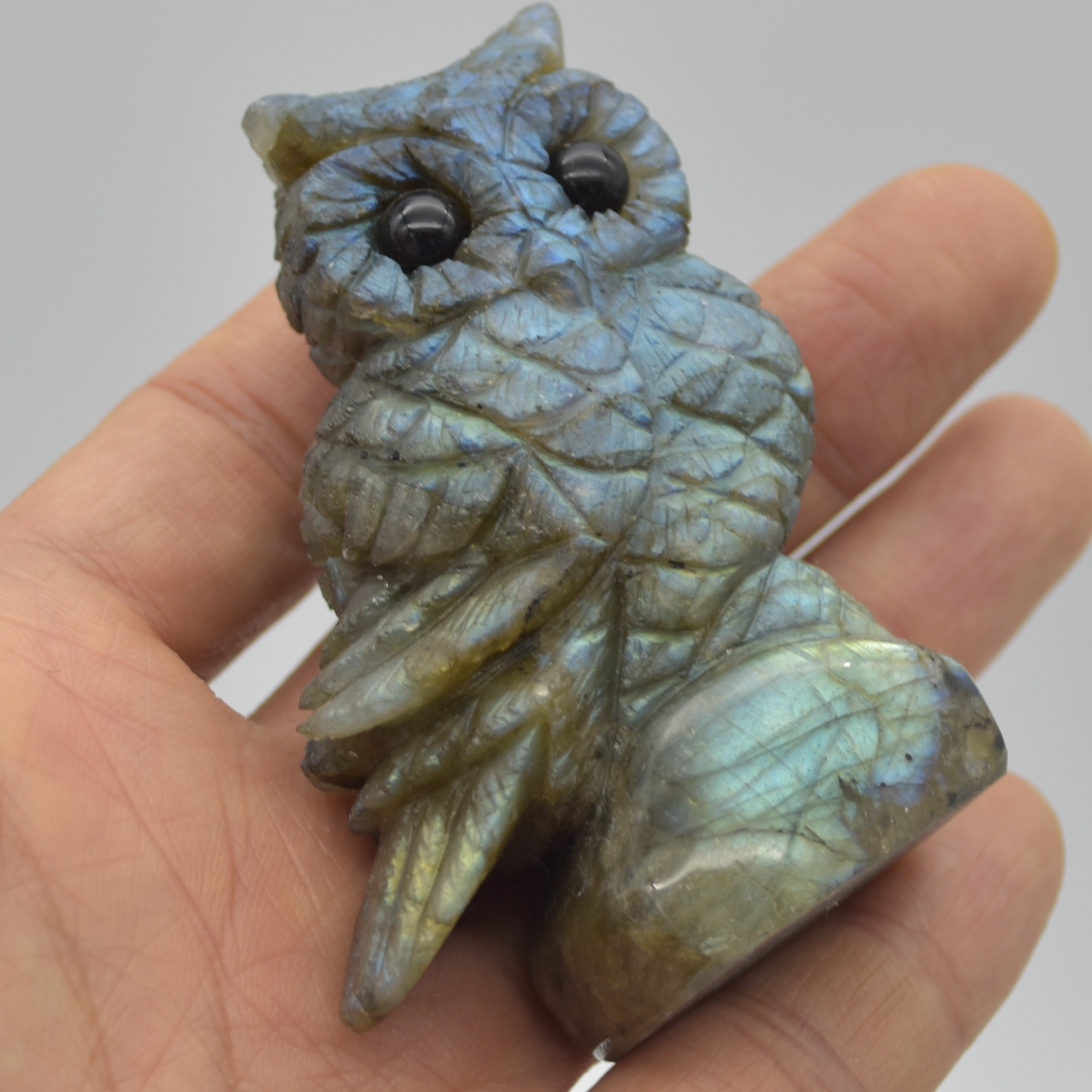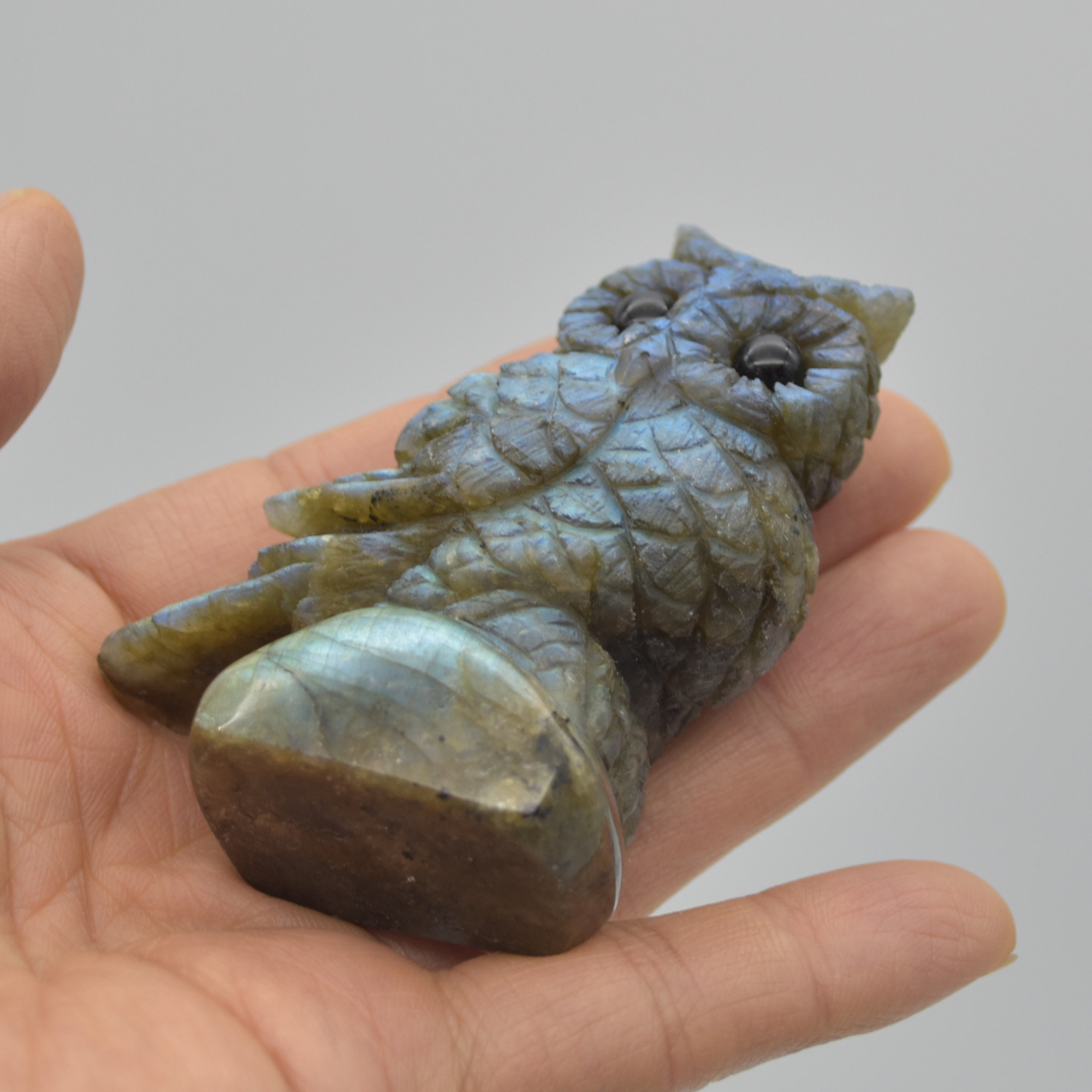 Labradorite carved owl with stunning blue and green iridescent hues
