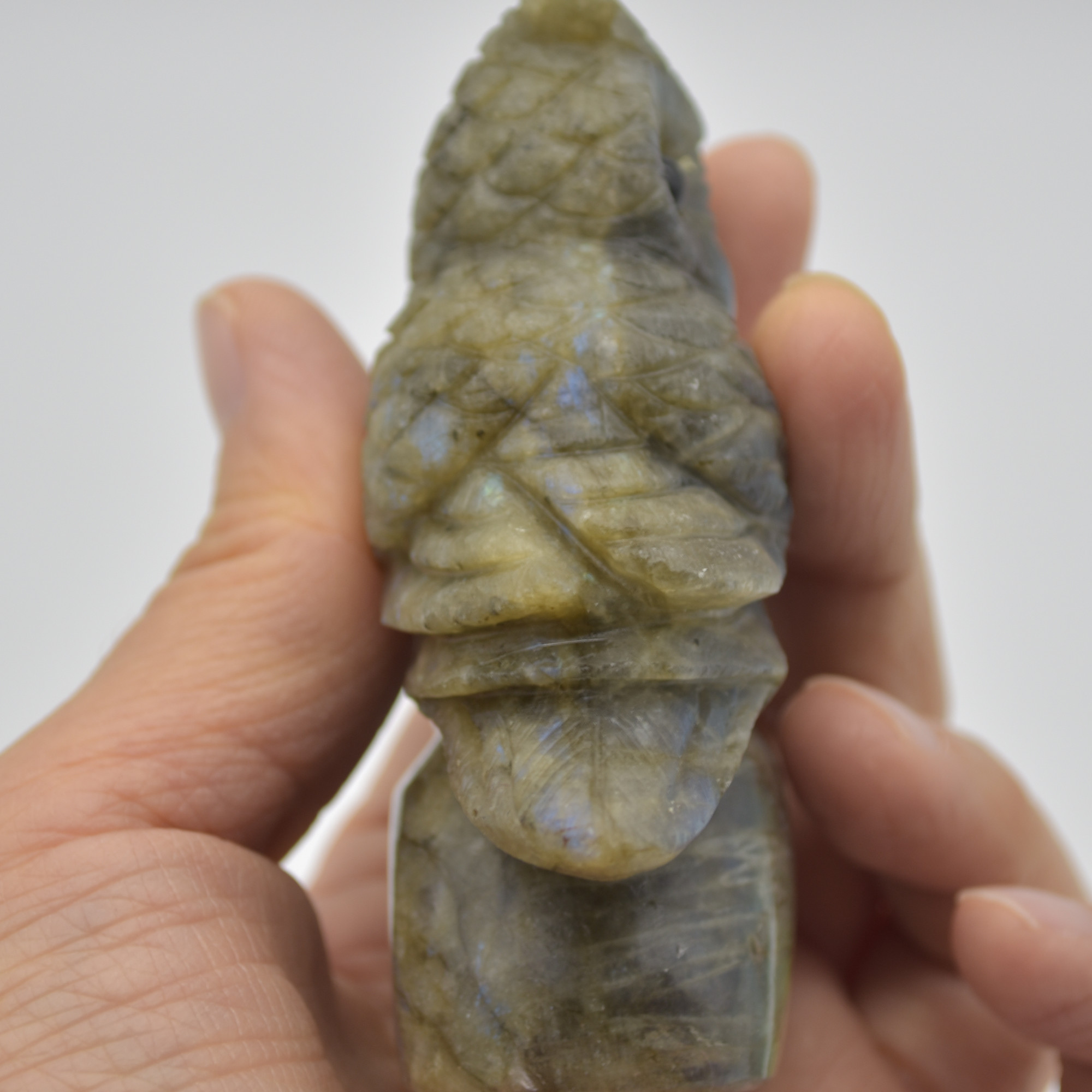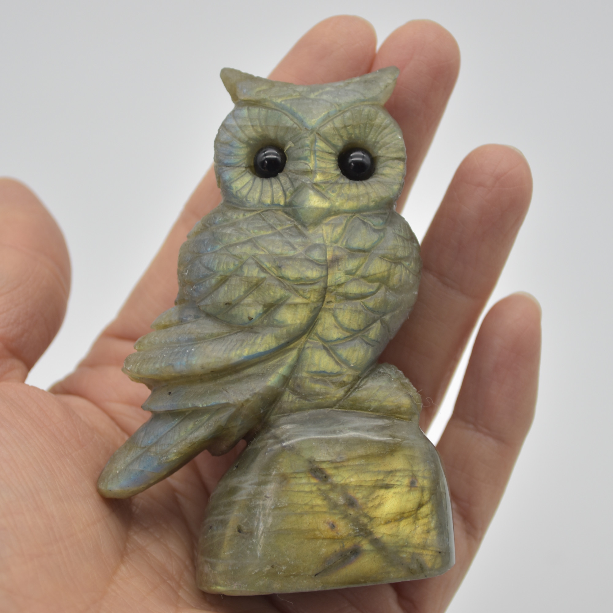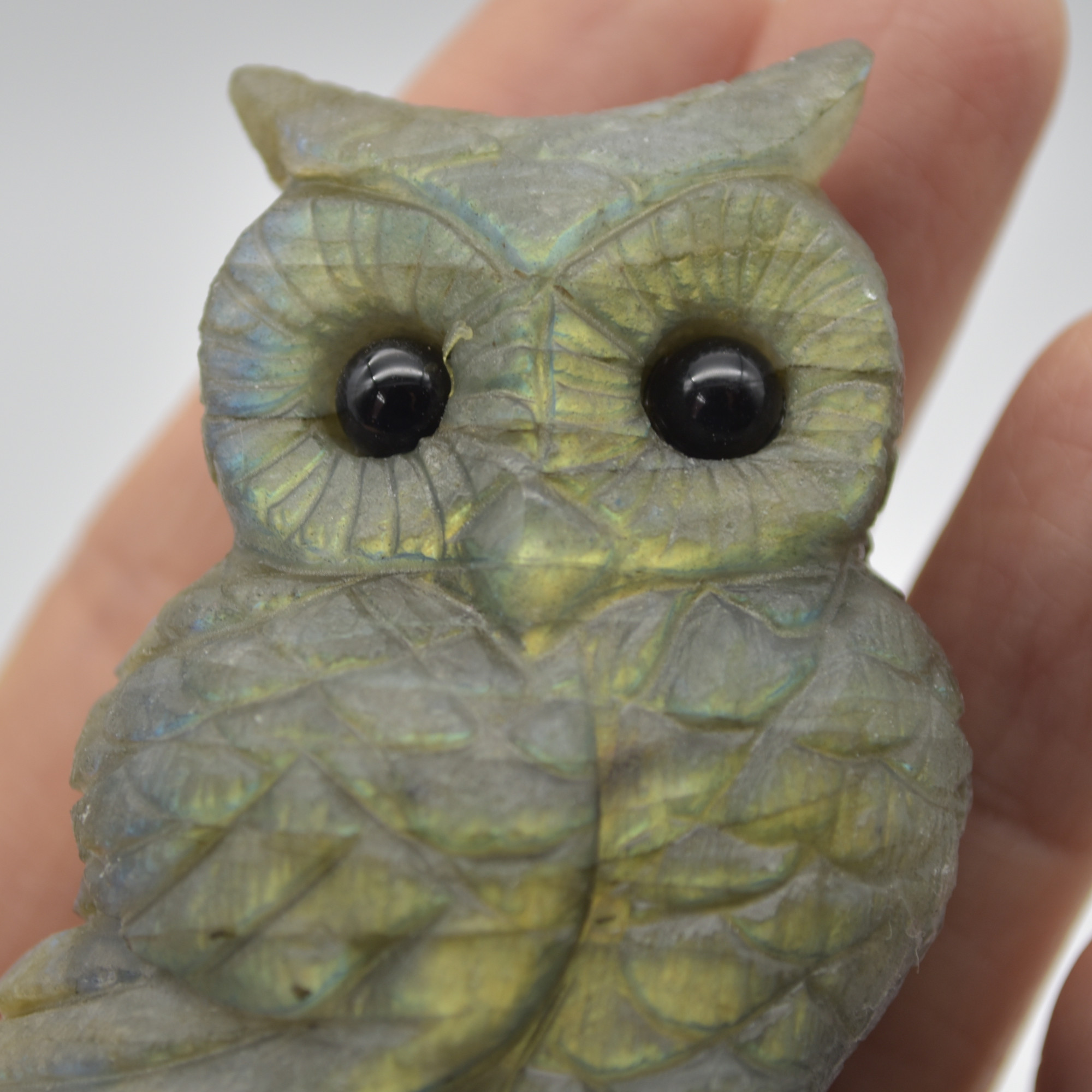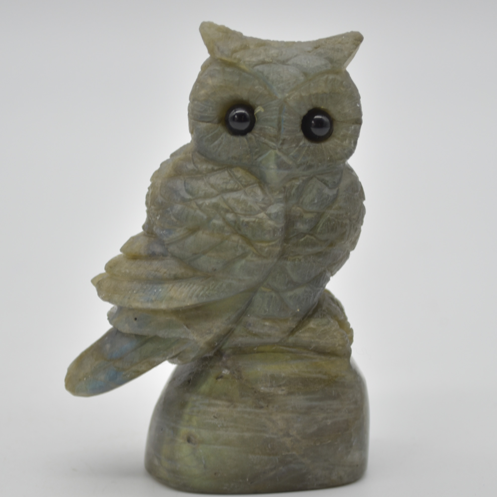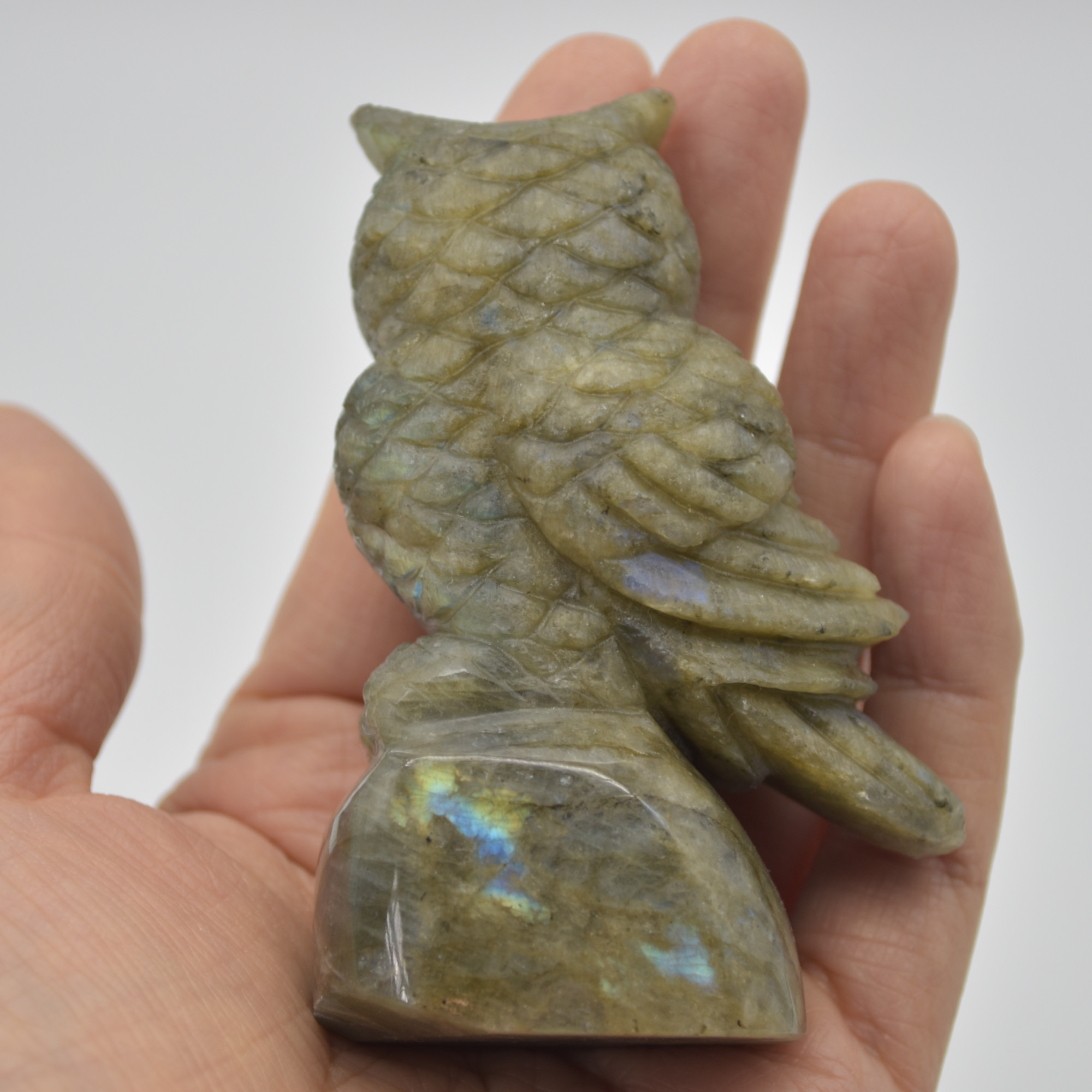 Labradorite carved owl with stunning blue and green iridescent hues