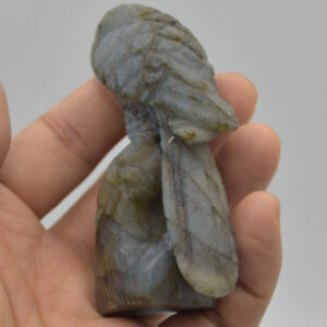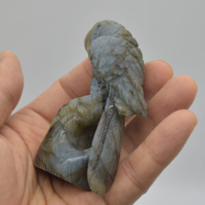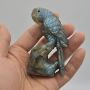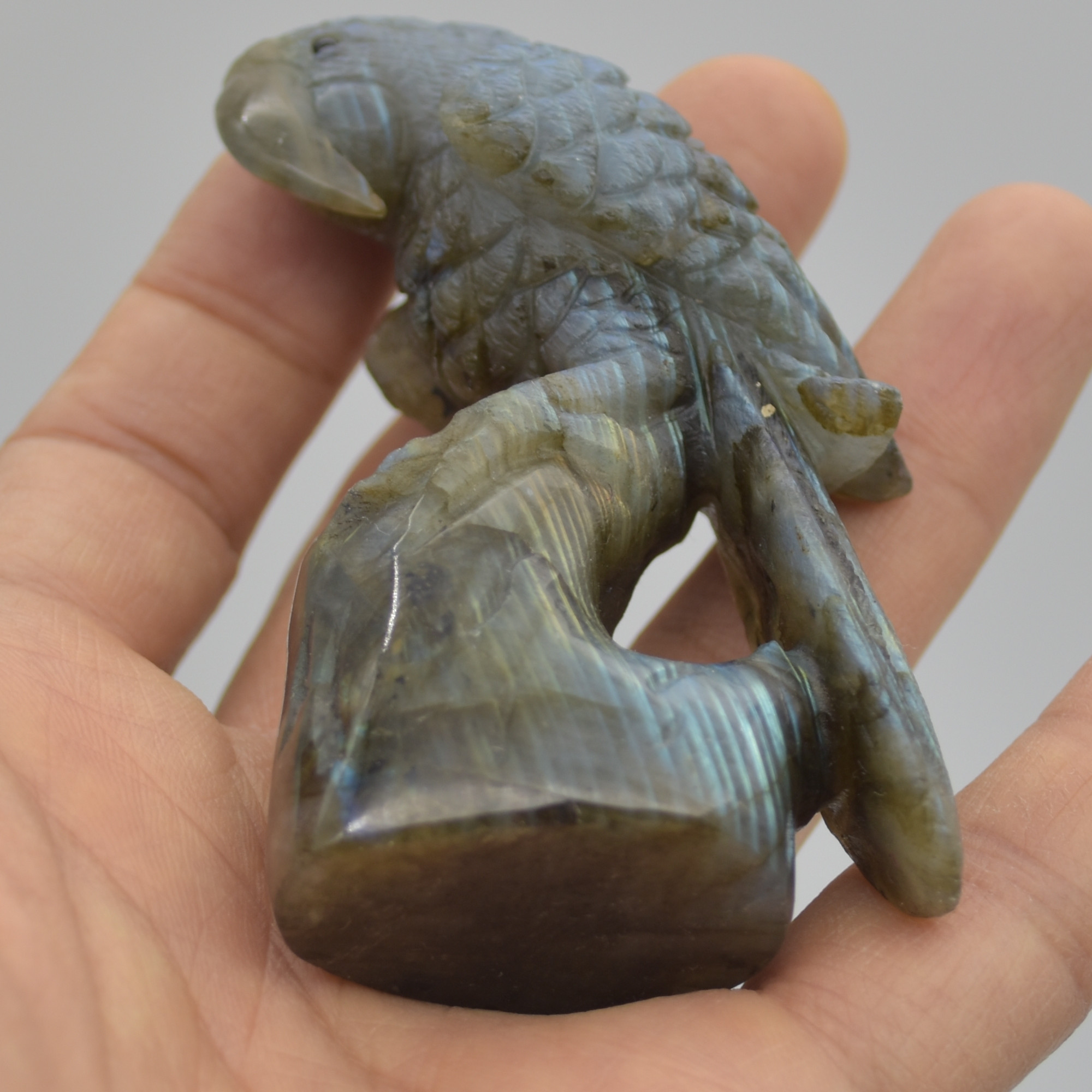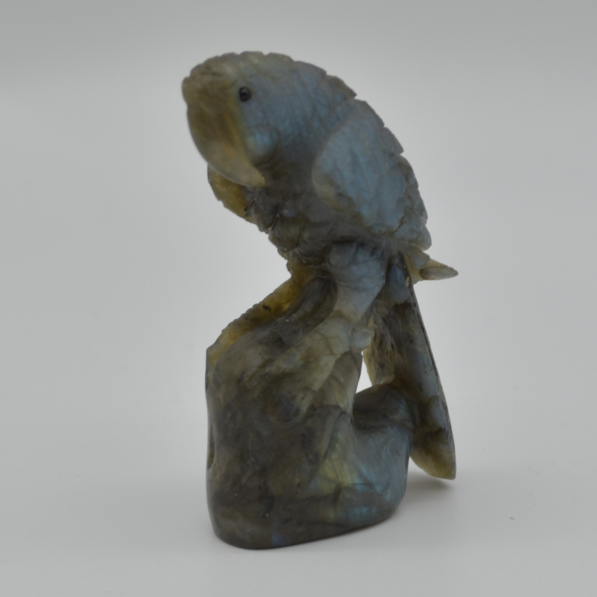 Labradorite carved parrot with stunning blue and green iridescent hues