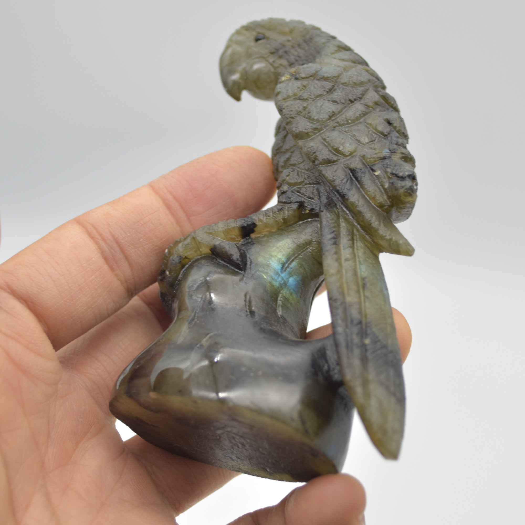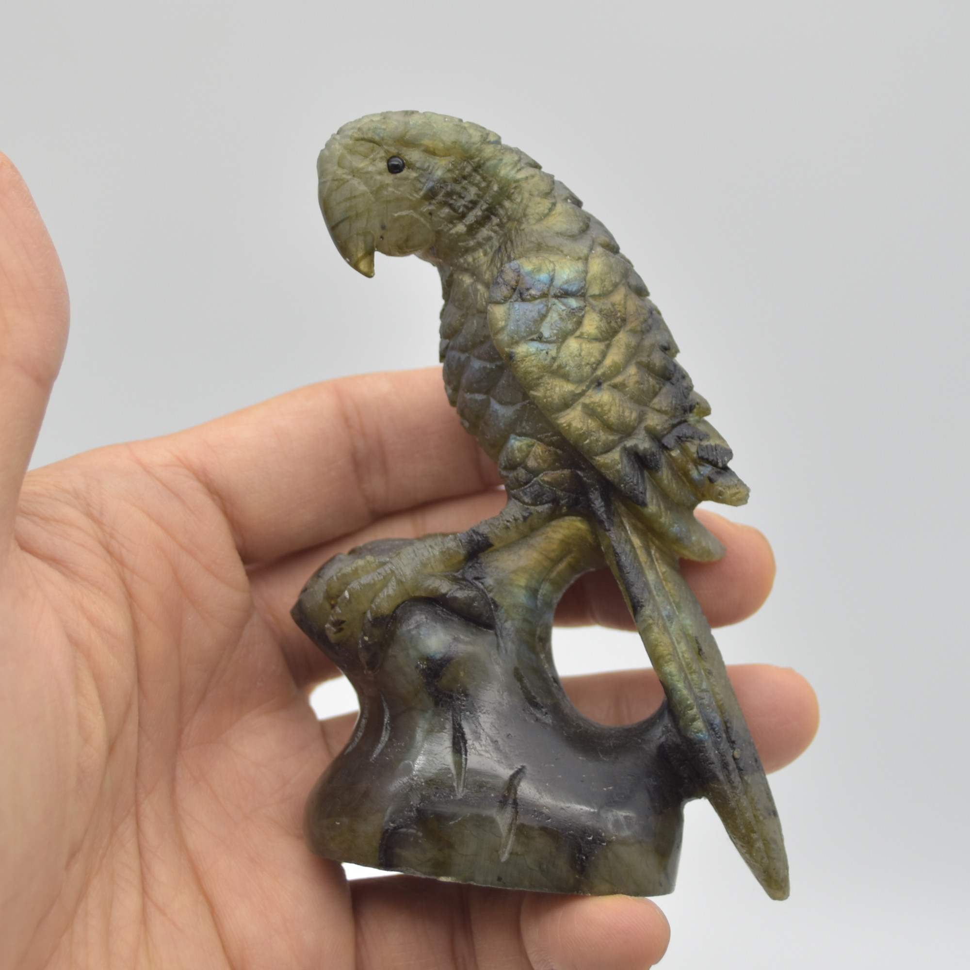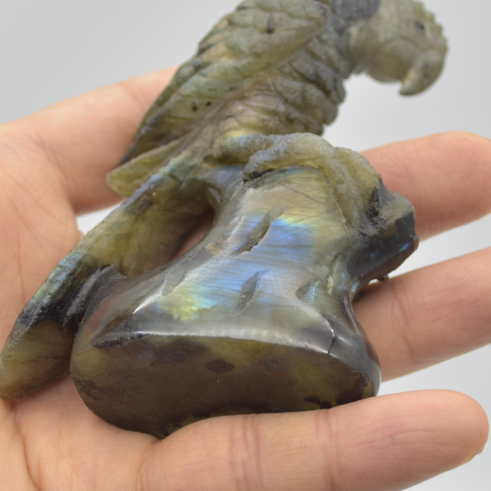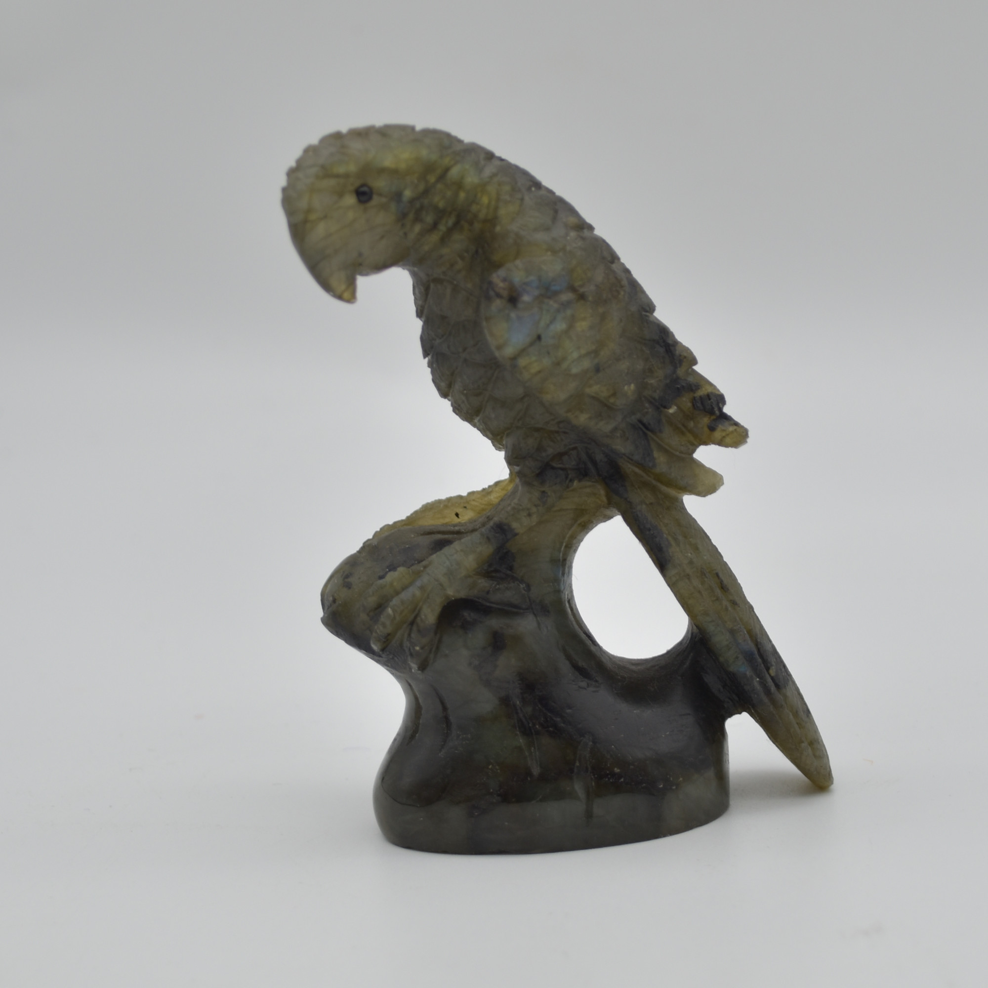 Labradorite carved parrot with stunning blue and green iridescent hues