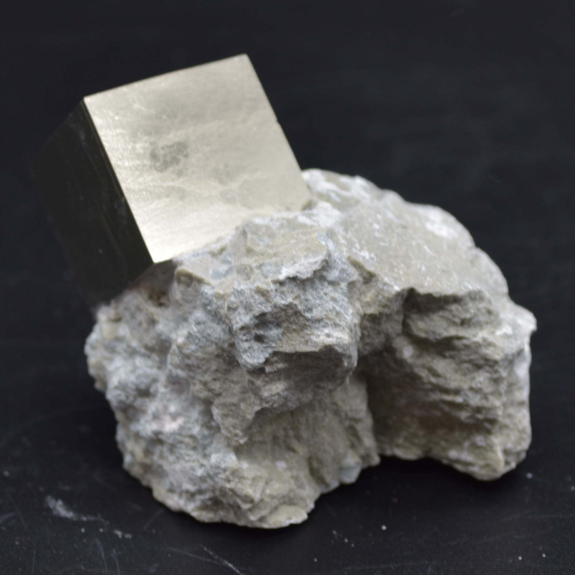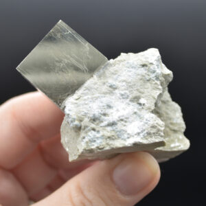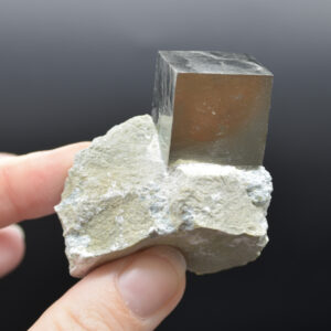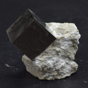 A perfect 3D cube with smooth metallic mirror lustre faces, formed naturally in Navajun, Spain. This area has had perfect conditions for forming pyrite for millions of years and is located within the Cameros Basin, on the eastern side. In this basin, a perfect mixture of aquifers settles above rocks which are subject to low-grade hydrothermal metamorphism. In simpler terms, there is just the right amount of pressure, minerals, and water to produce nearly perfectly shaped pyrite crystals