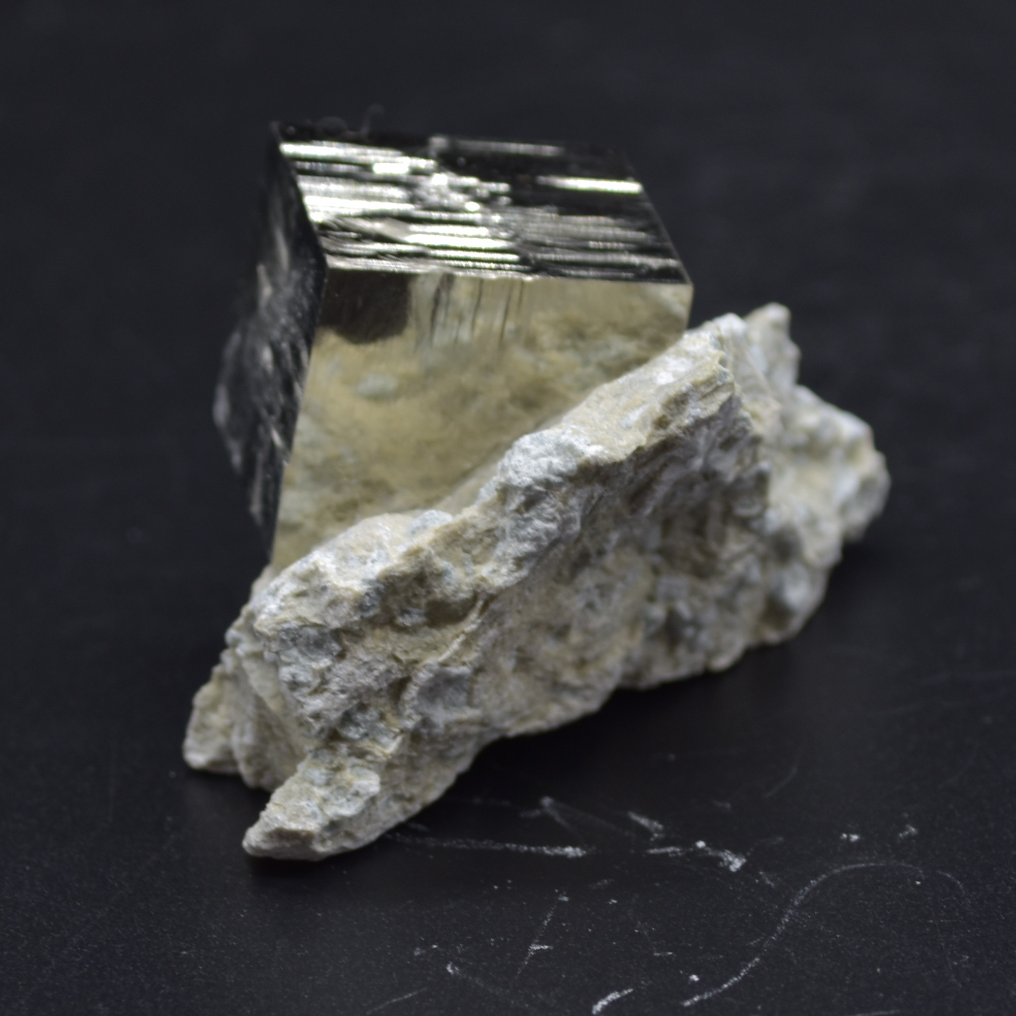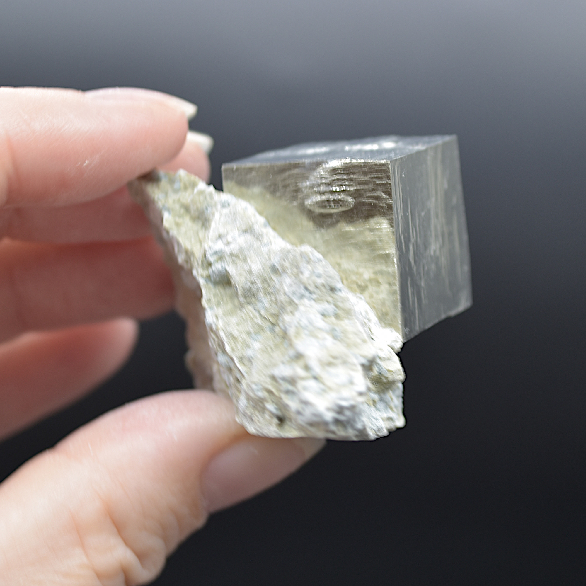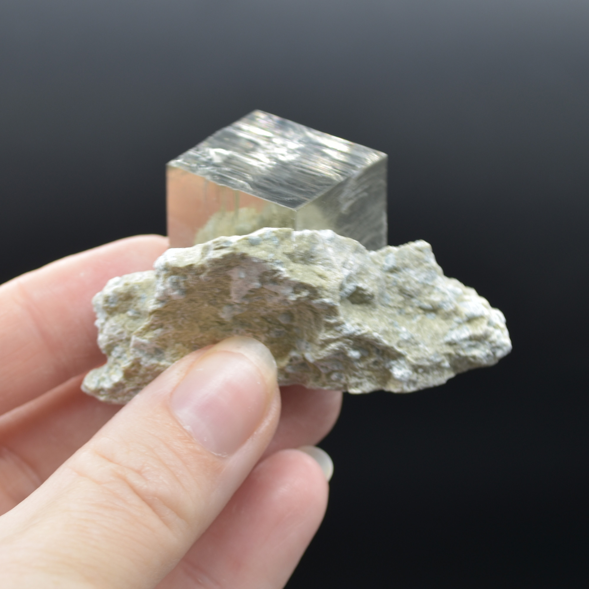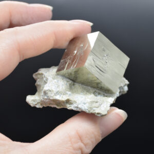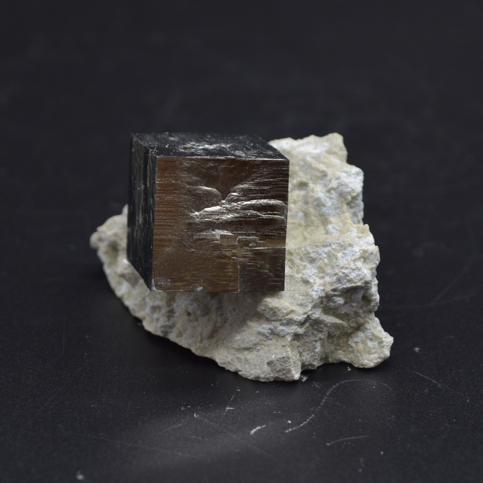 A perfect 3D cube with smooth metallic mirror lustre faces, formed naturally in Navajun, Spain. This area has had perfect conditions for forming pyrite for millions of years and is located within the Cameros Basin, on the eastern side. In this basin, a perfect mixture of aquifers settles above rocks which are subject to low-grade hydrothermal metamorphism. In simpler terms, there is just the right amount of pressure, minerals, and water to produce nearly perfectly shaped pyrite crystals