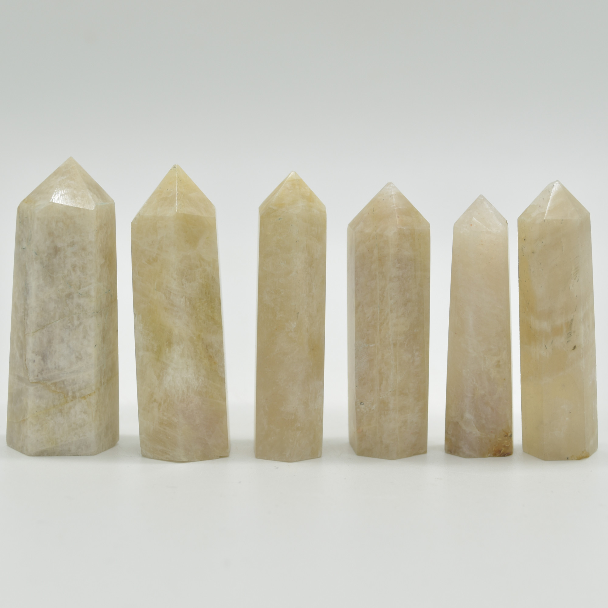 These are carved from natural stone so they are not perfect and flawless. Natural inclusions, cracks, crystallization and pockets are all visible and all part of the natural stone. Some points have iridescent hues and some are plain coloured. Each point will vary. Please handle with extra care.