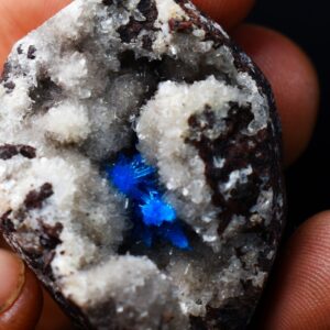 Cavansite and Pentagonite are soft minerals (Mohs Hardness 3-4). Handle with care. Keep away from direct sunlight for extended periods and avoid contact with water or harsh chemicals. Gently dust with a soft dry brush only.