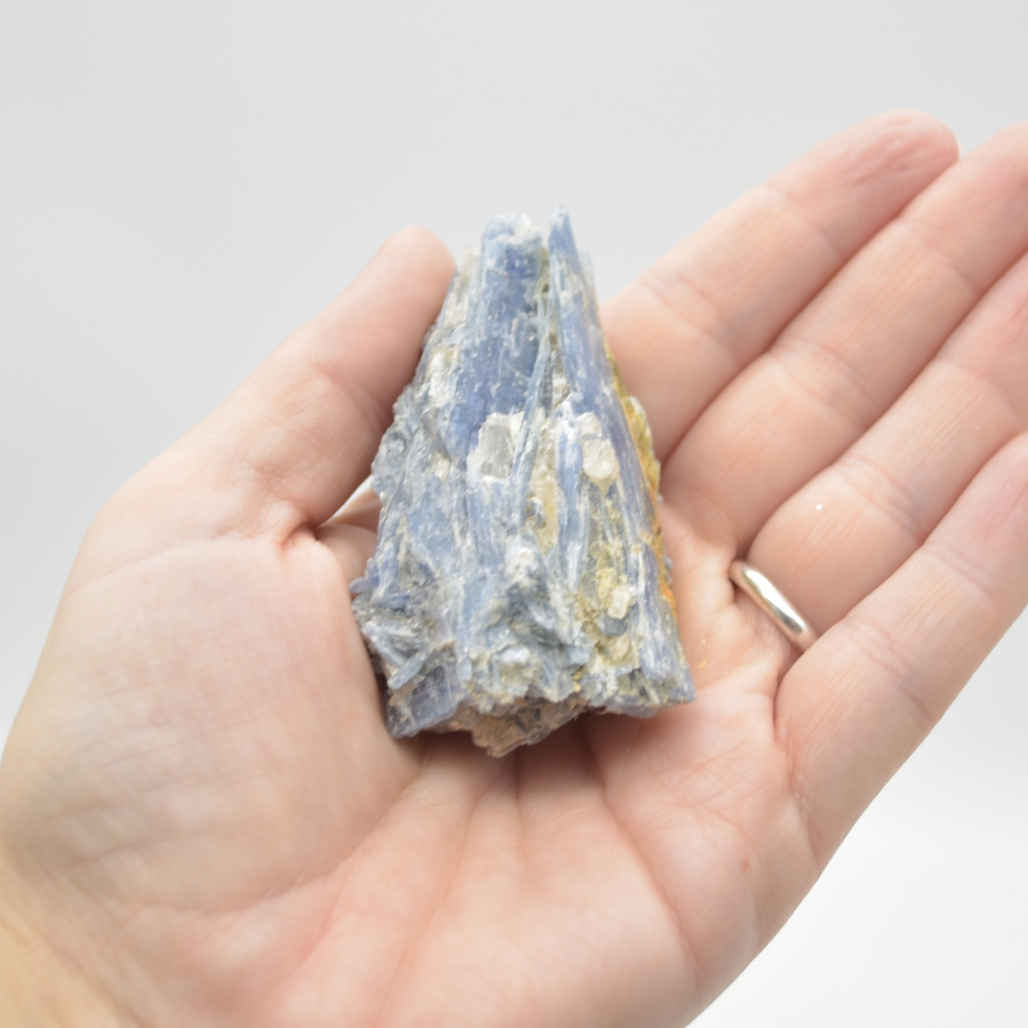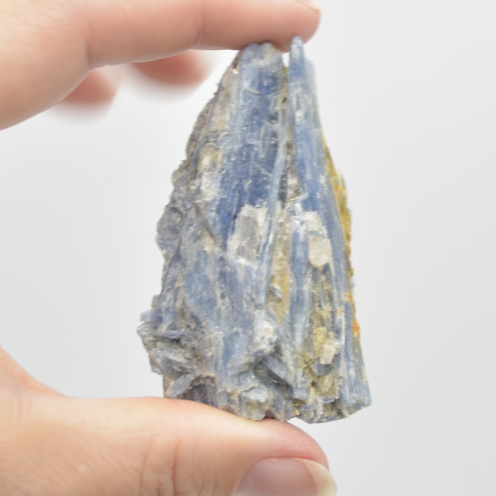 Kyanite is an aluminium silicate mineral, often occurring as long, striated bladed crystals that may be transparent or translucent with a pearly sheen. The most common colours in metaphysical use are blue streaked with white.