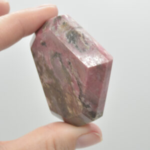 Rhodonite is famous for its rosy red shade although another identifying colour for rhodonite is its dark brown or black inclusions. These inclusions appear as veins or colour zones, and they are caused by manganese oxide. Some rhodonite stones have so much manganese oxide, they appear almost completely black due to surface oxidation (rust).