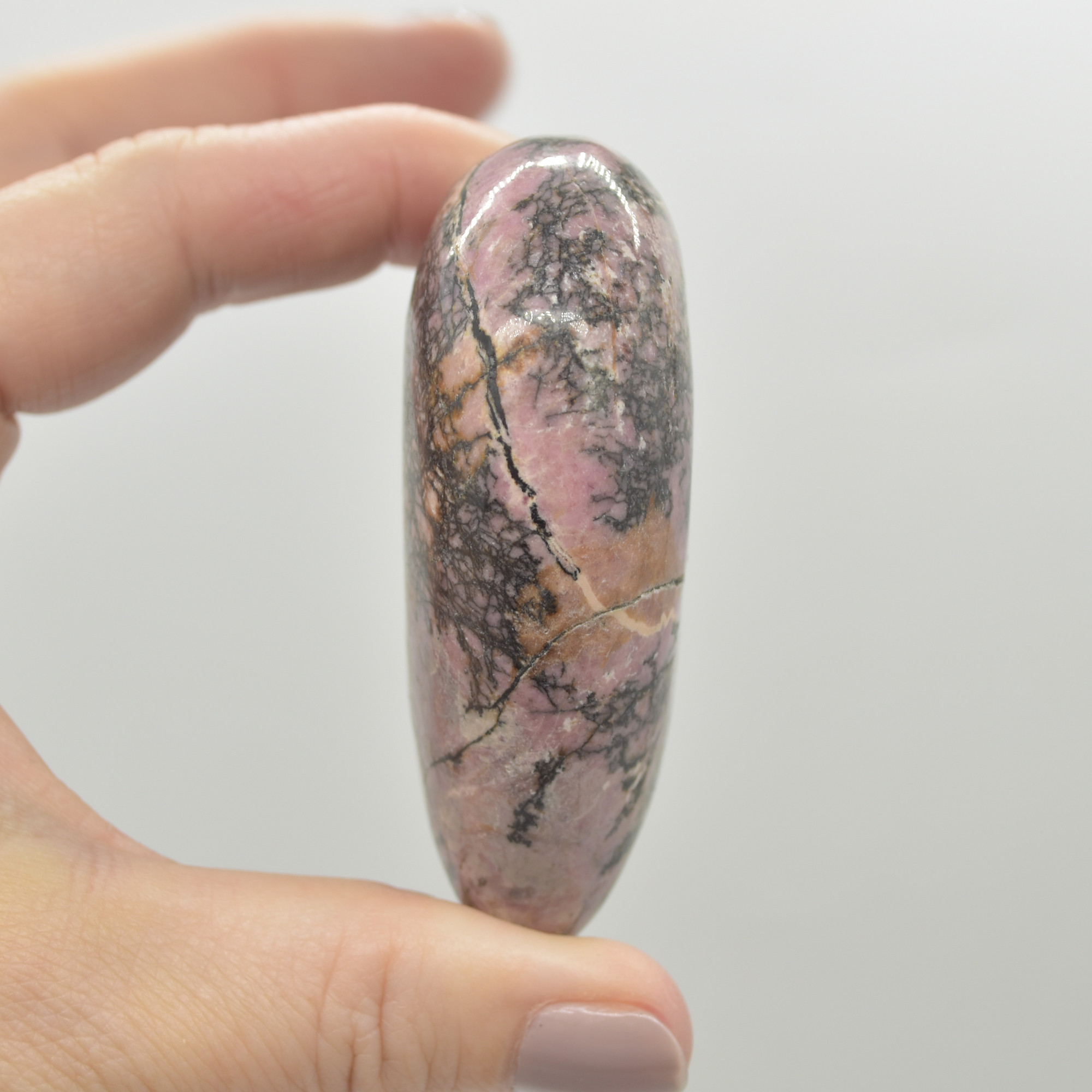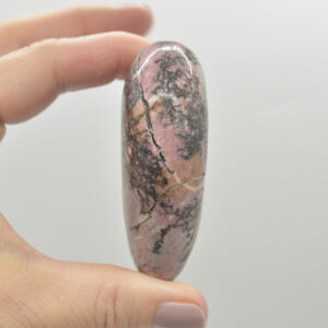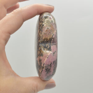 Rhodonite is famous for its rosy red shade although another identifying colour for rhodonite is its dark brown or black inclusions. These inclusions appear as veins or colour zones, and they are caused by manganese oxide. Some rhodonite stones have so much manganese oxide, they appear almost completely black due to surface oxidation (rust).