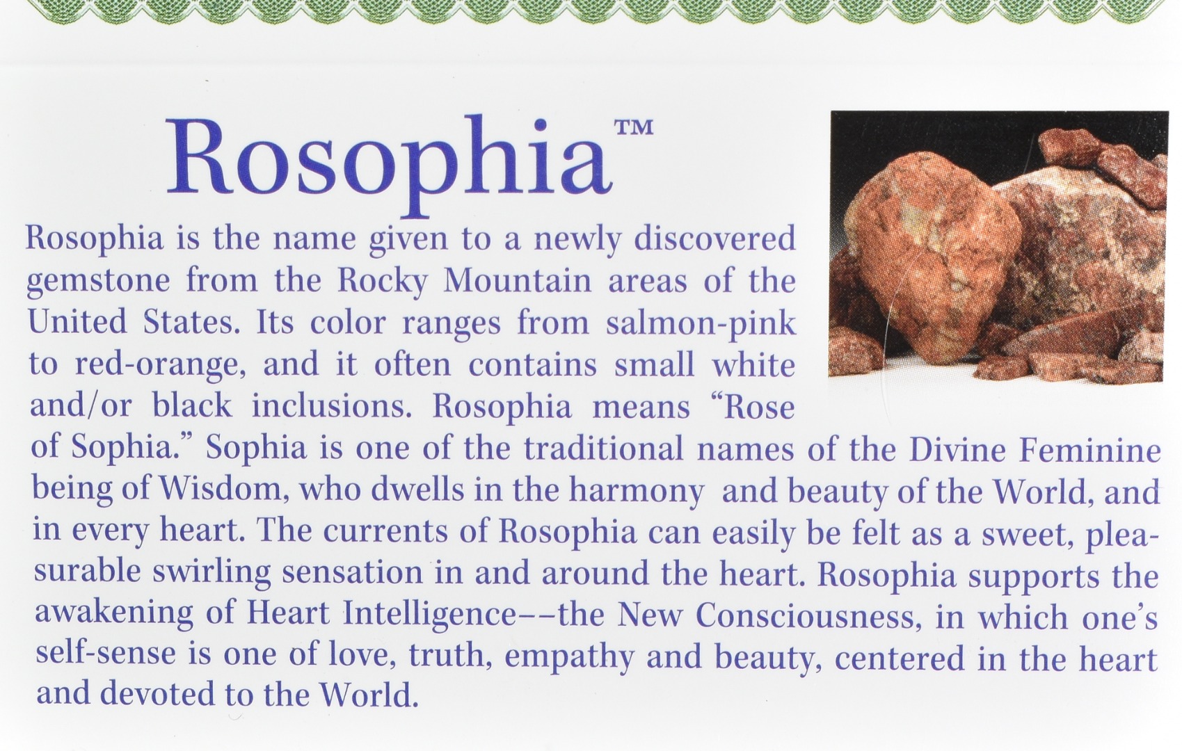 - Rosophia is the name given to the newly discovered gemstone from the USA. Its colours range from salmon pink to red-orange and it often contains small white or black inclusions.