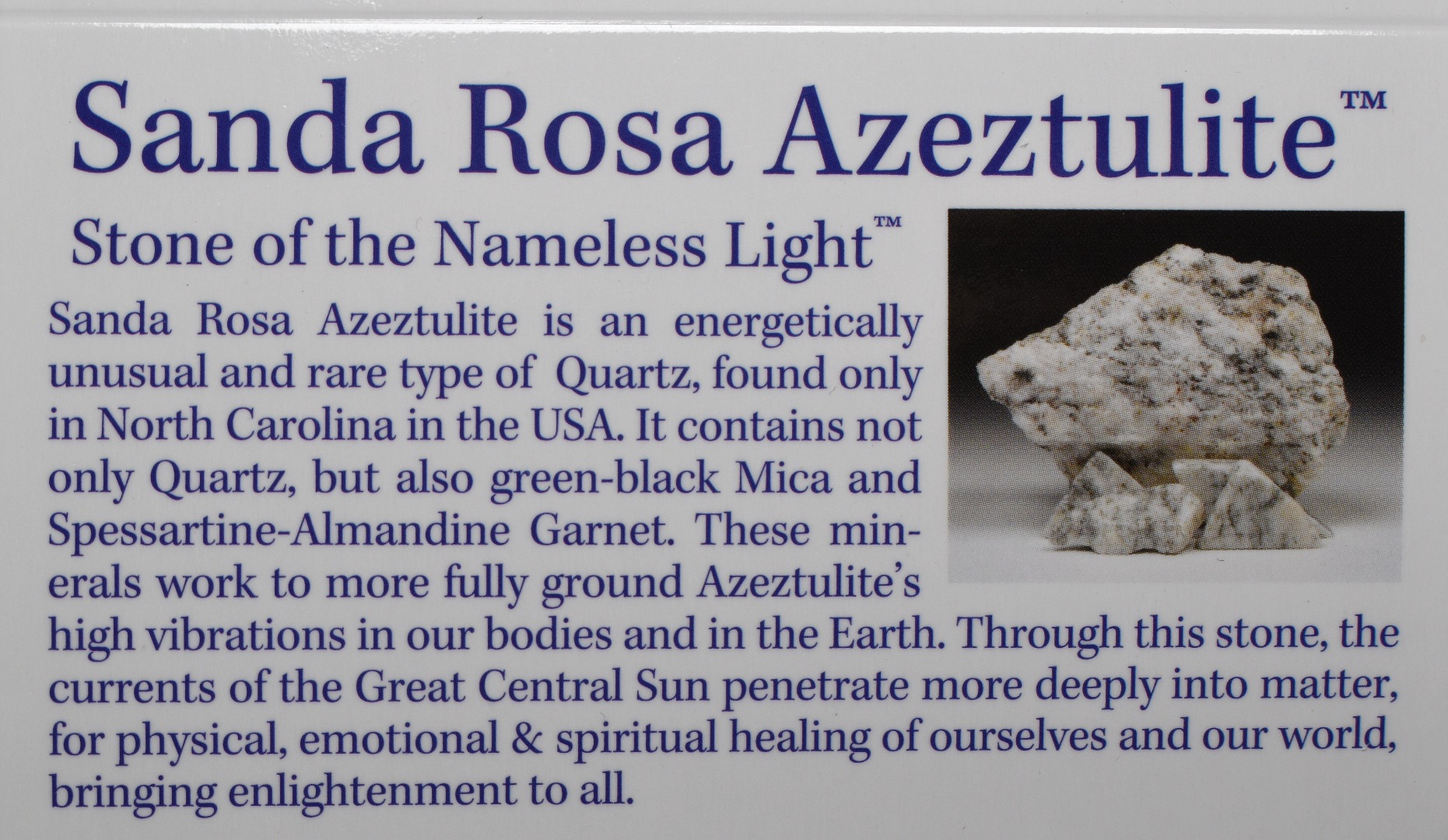 - Sanda Rosa Azeztulite is a newly discovered variety of Quartx which can only be found in North Carolina, USA. It is a mix or Quartz with green-black Mica and Spessartine-Almandine Garnet inclusions.