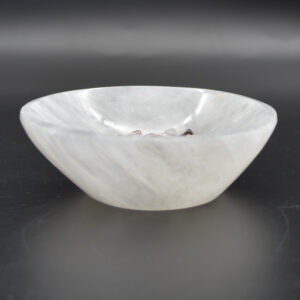 These bowls are made from white fibrous Satin Spar which is a variety of Gypsum. The stone is often called Selenite, although the two are closely related (they are both forms of Gypsum), Selenite actually grows in large clear crystal forms. Satin Spar is a very delicate stone and can easily scratch and mark and should be handled with care.