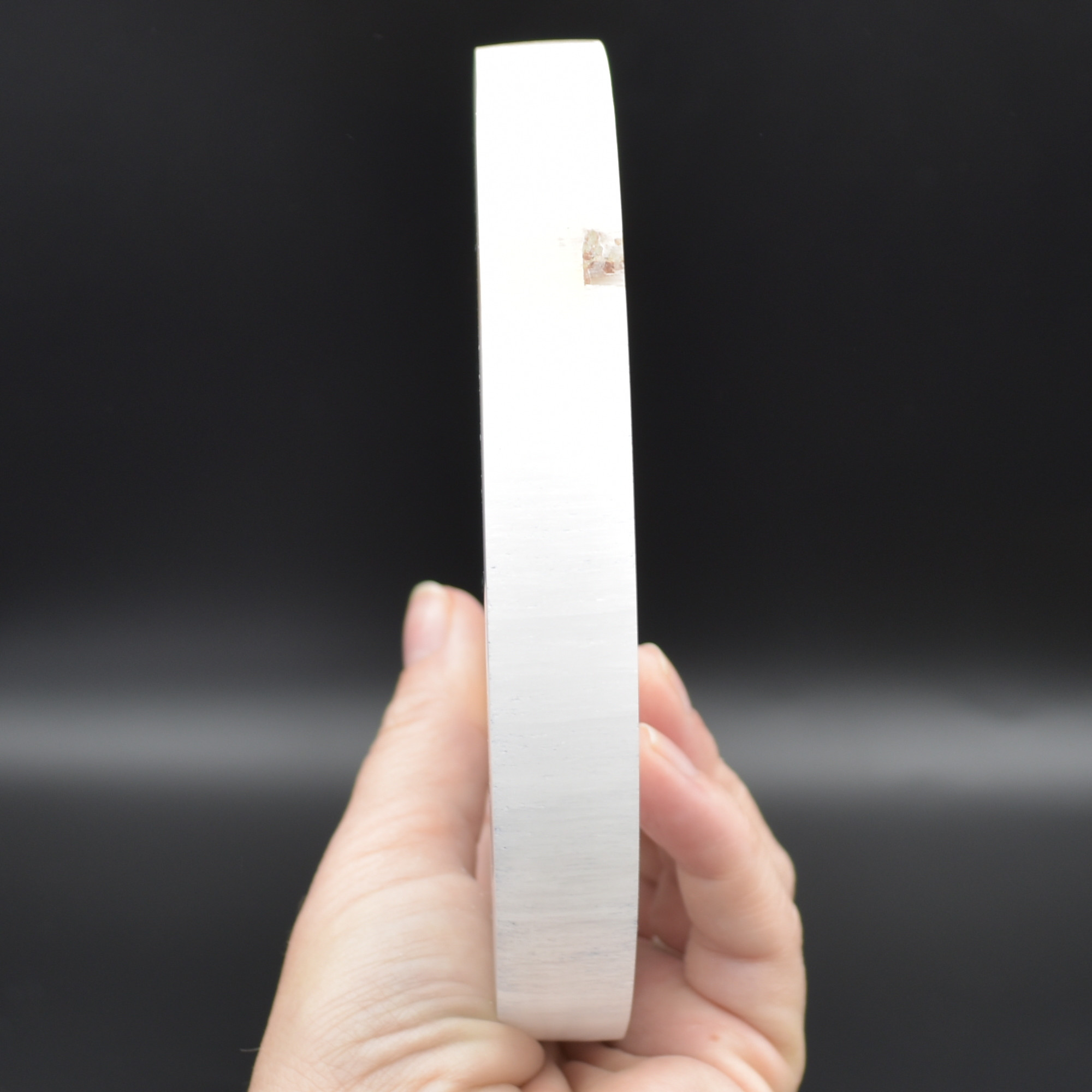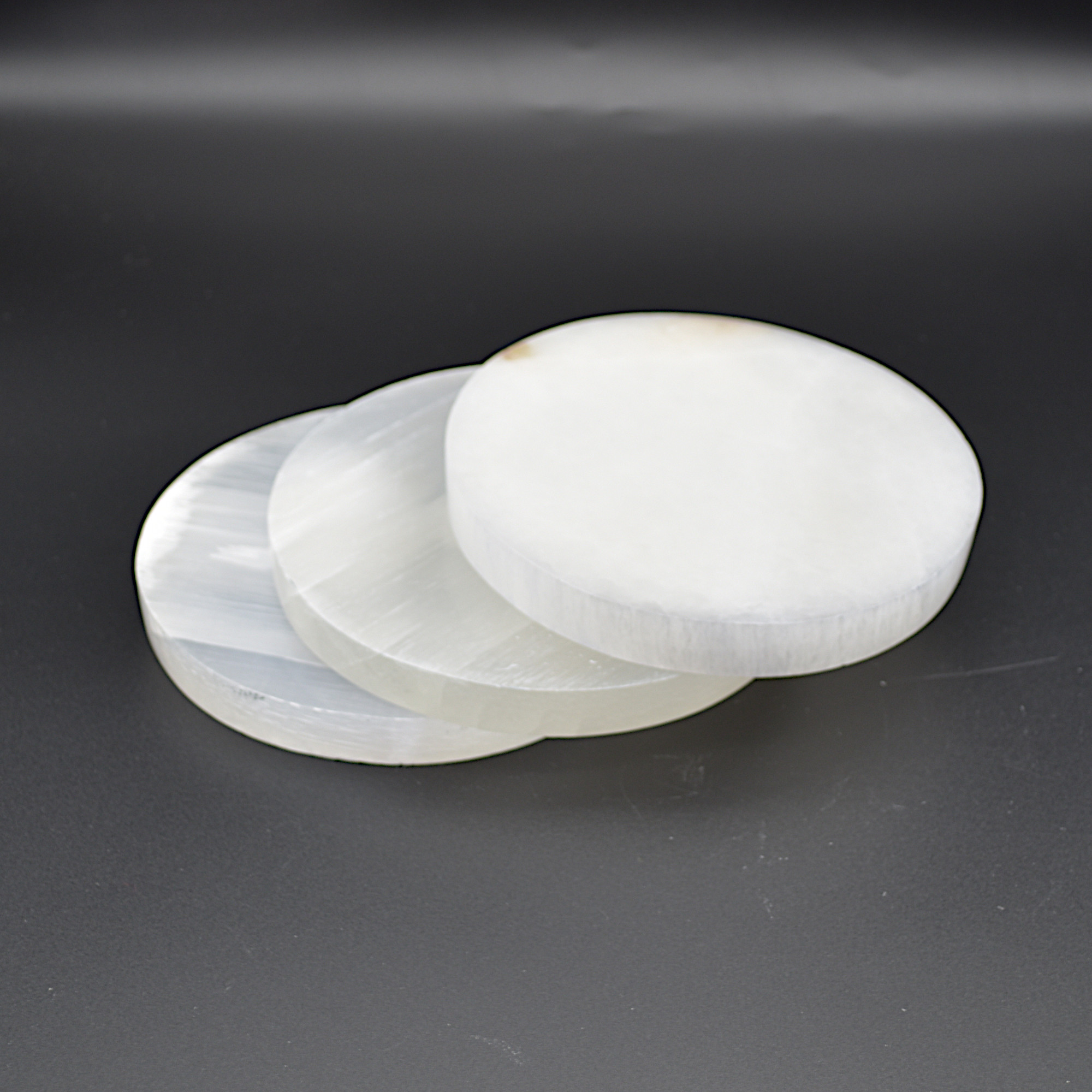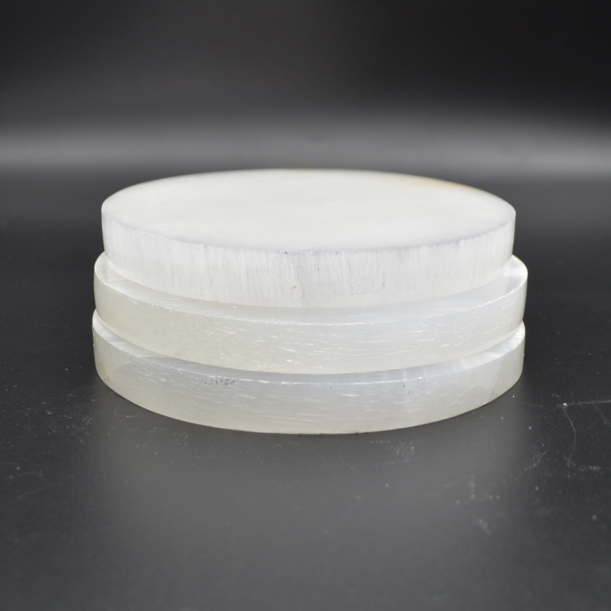 These plates are made from white fibrous Satin Spar which is a variety of Gypsum. The stone is often called Selenite, although the two are closely related (they are both forms of Gypsum), Selenite actually grows in large clear crystal forms. Satin Spar is a very delicate stone and can easily scratch and mark and should be handled with care.