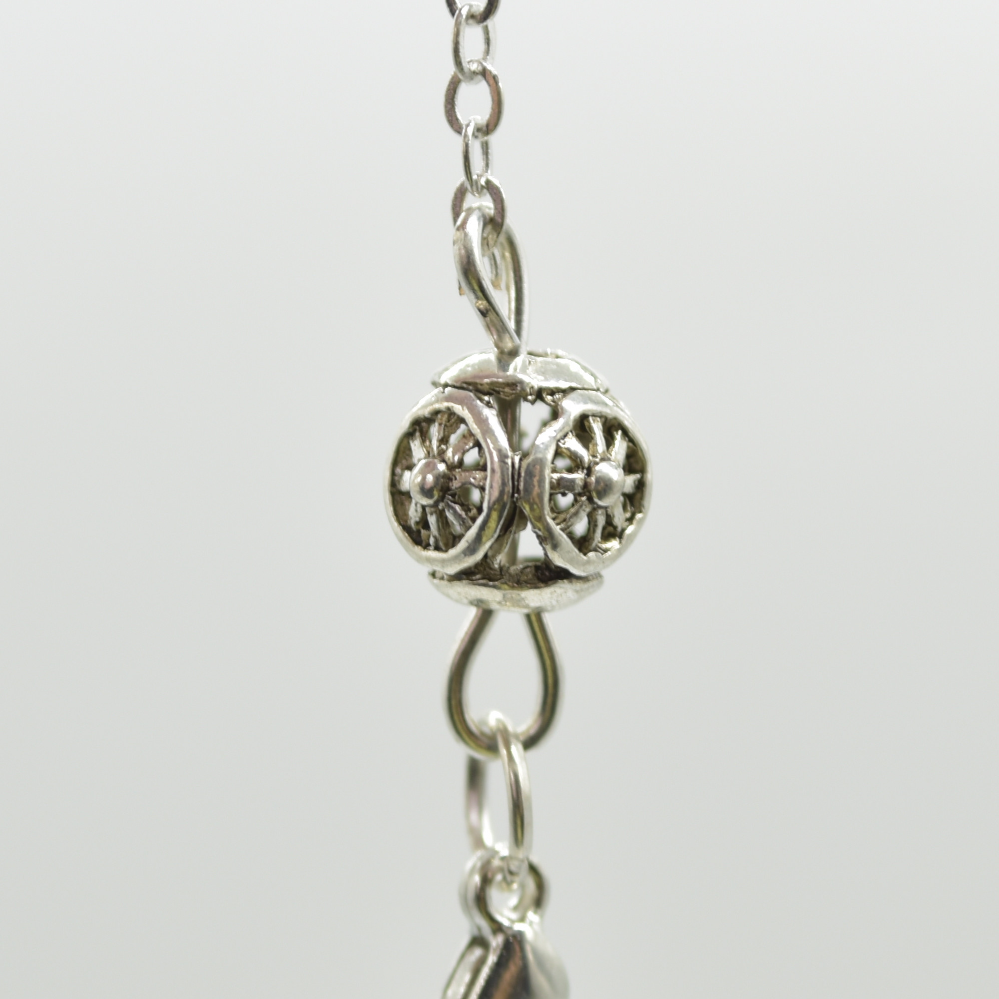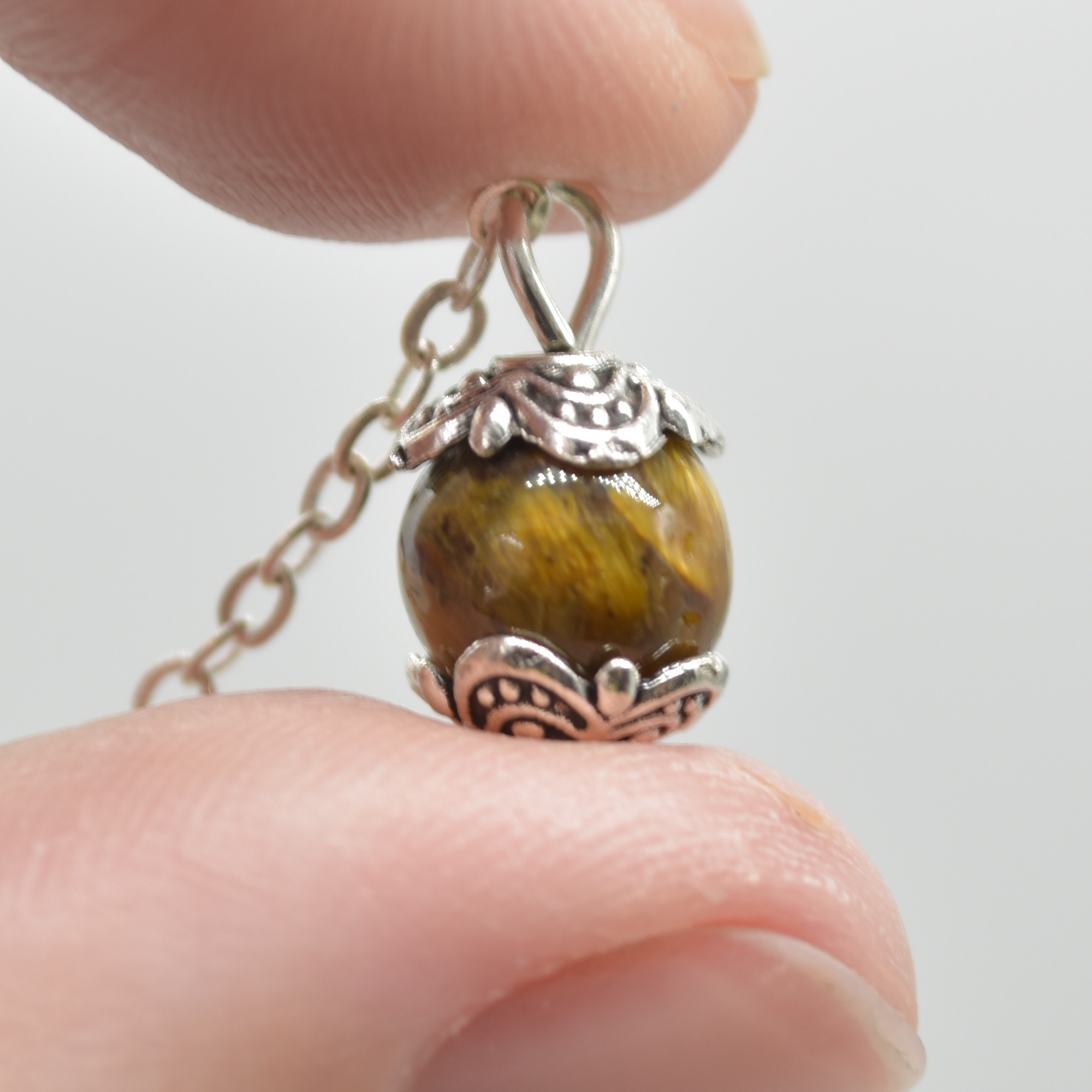 Each pendulum has a detachable silver trace chain with lobster clasp, small silver charm and a 8mm round tiger eye round gemstone.