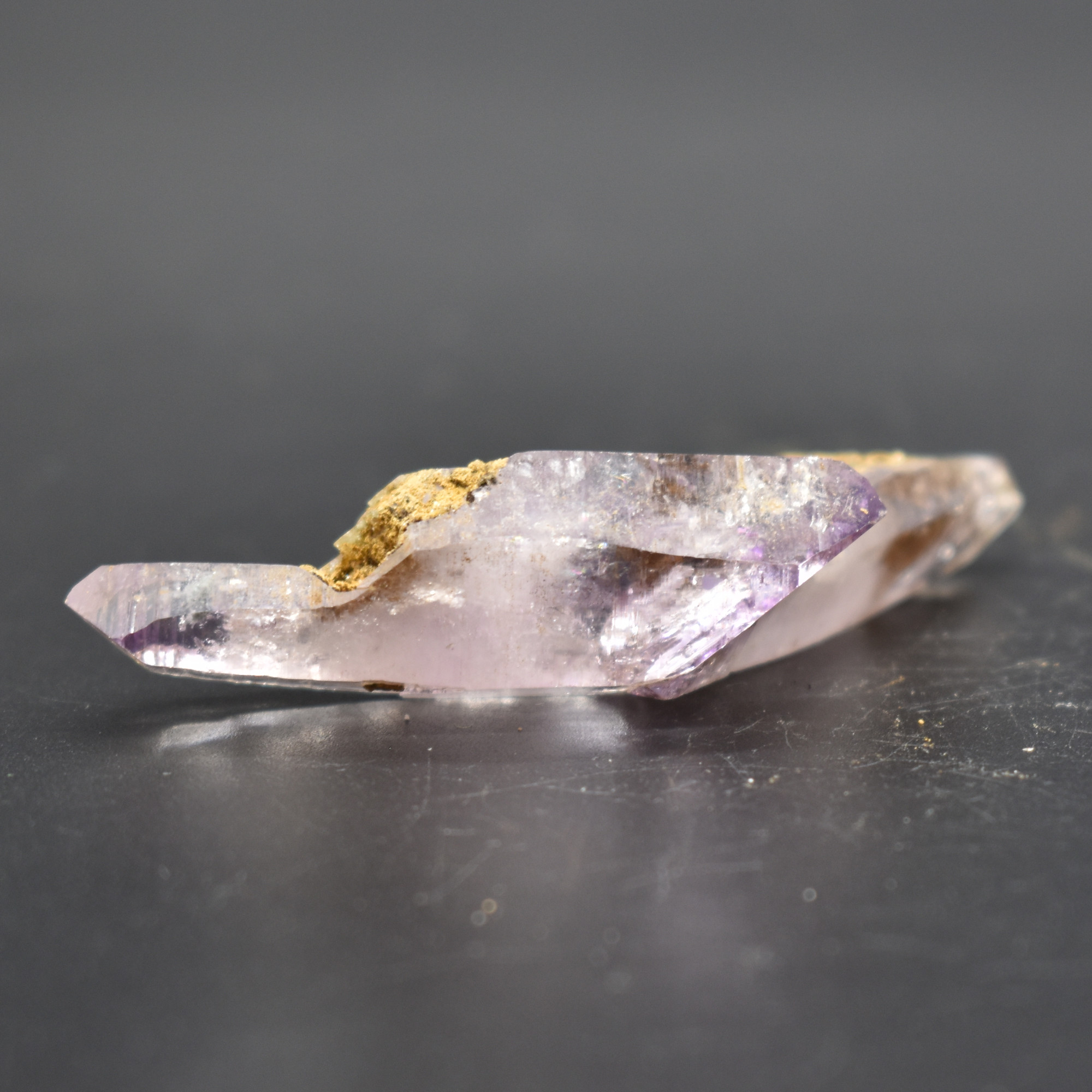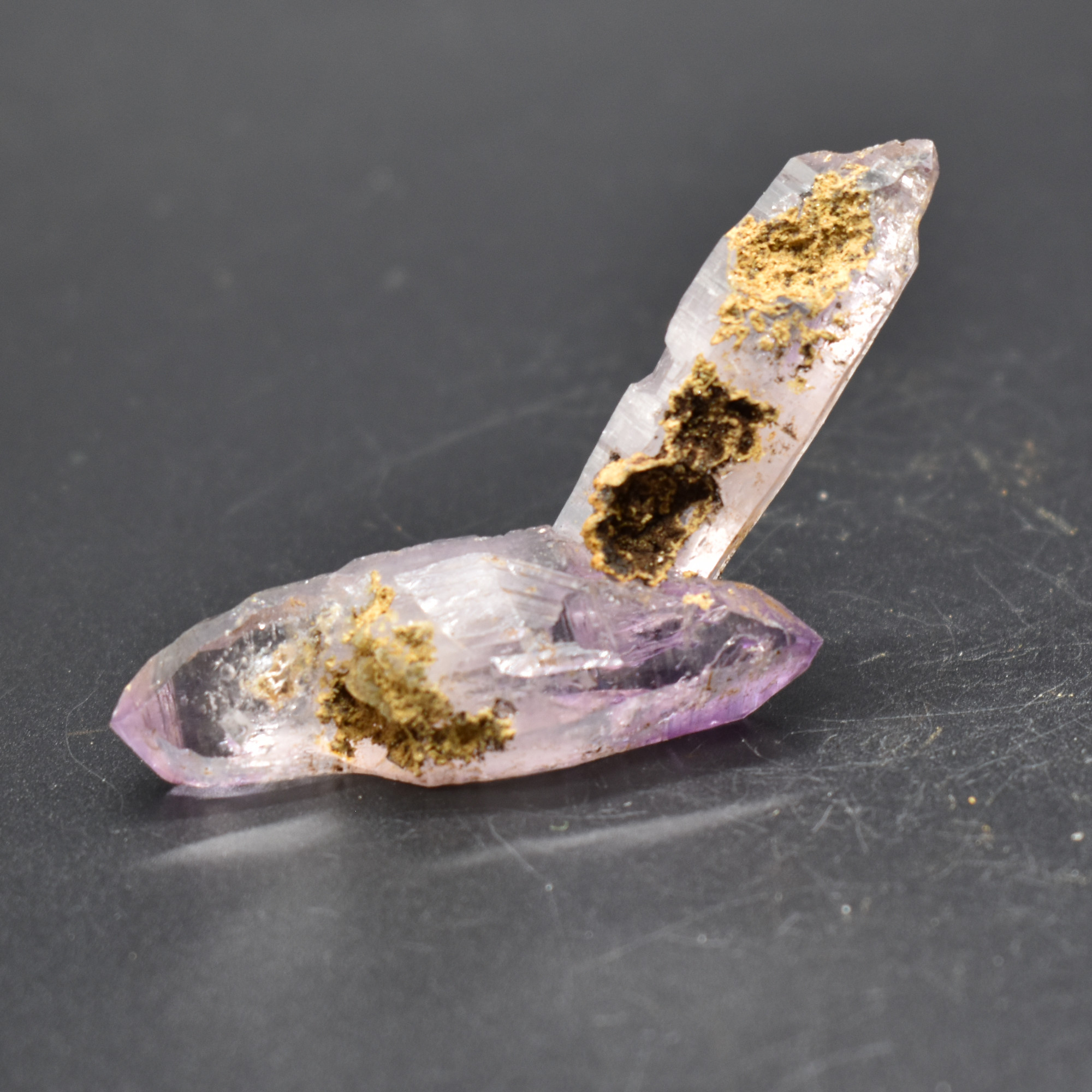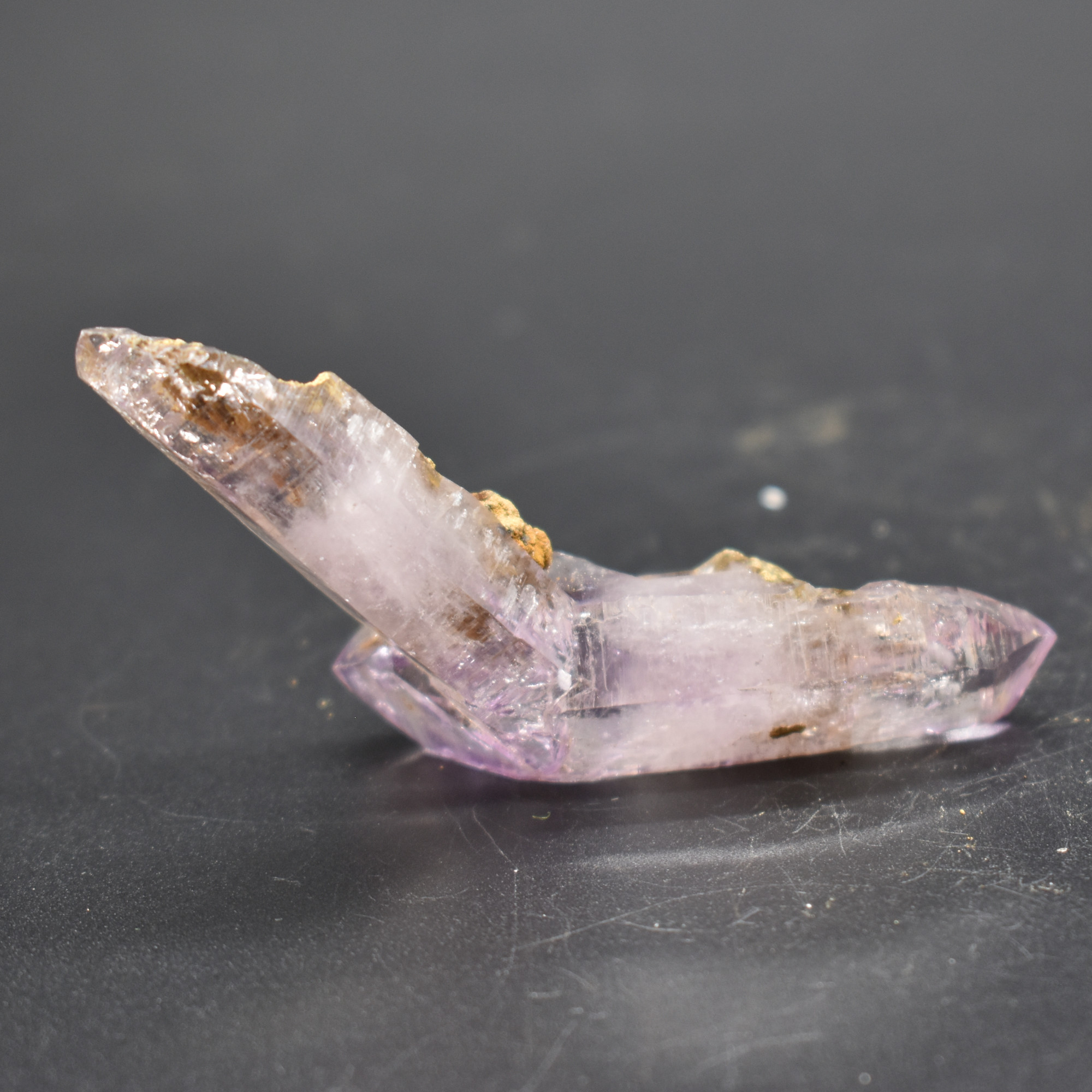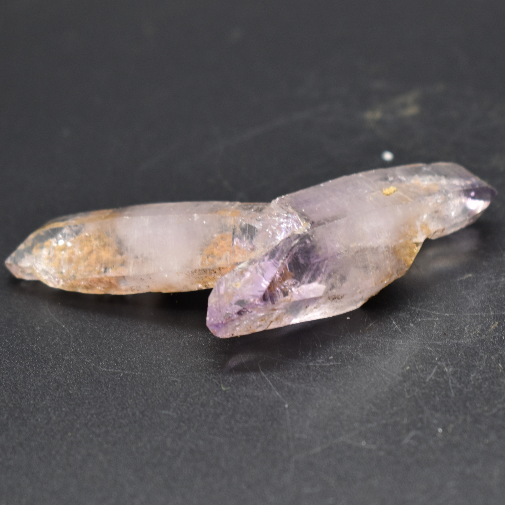 Amethyst most commonly forms in clusters or crystalline masses, however, Vera Cruz Amethyst forms as single or clustered stalactites, which are individual elongated crystal points with brilliant lustre which are often double terminated, some have scepter tips and many contain amethyst phantoms within their crystal shafts. On rare occasions, a water or gas bubble may also be present within the crystal. Graduated colouring can be seen with the darker colouring towards the top of the point while the pale, softer colours are merged into the stone.
