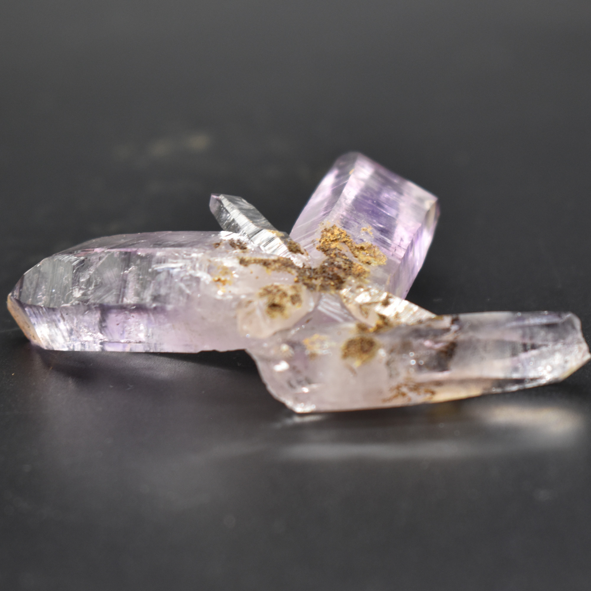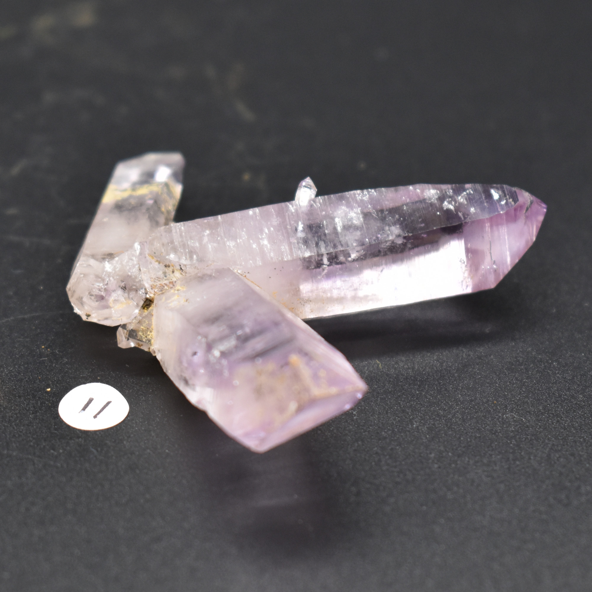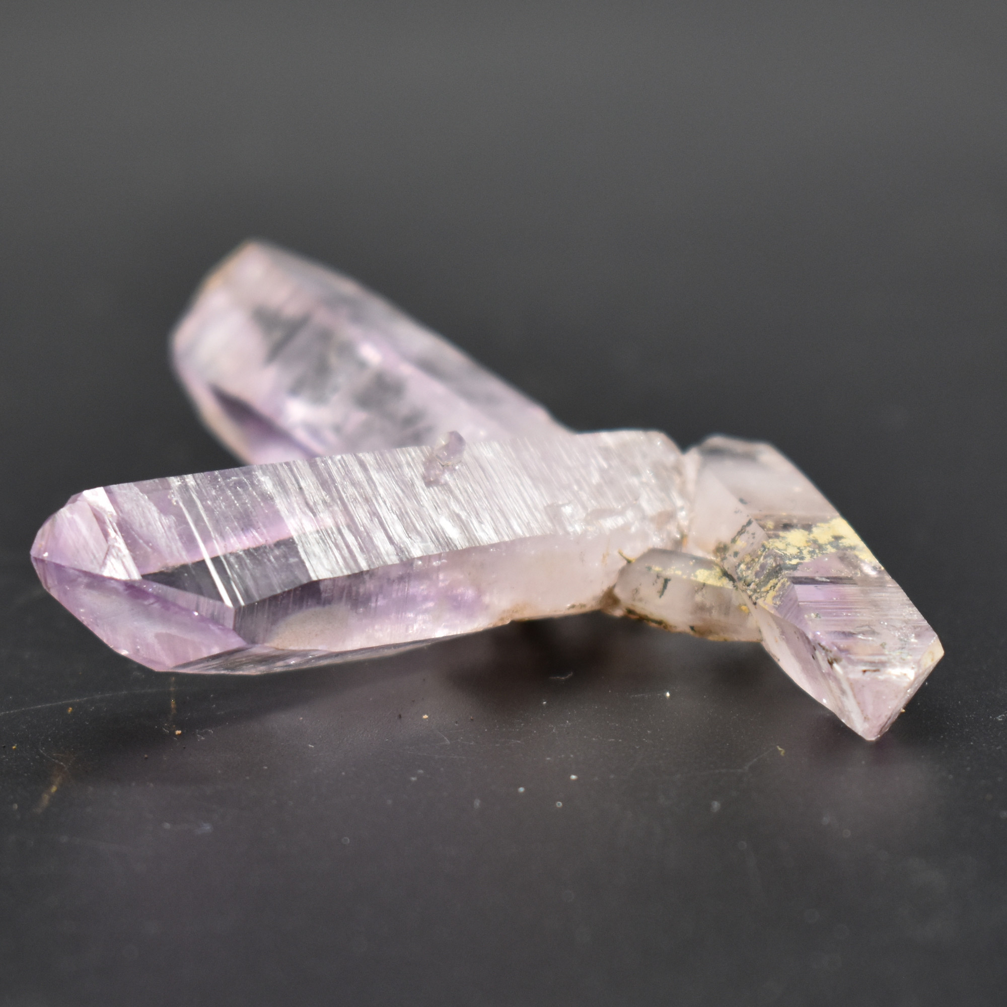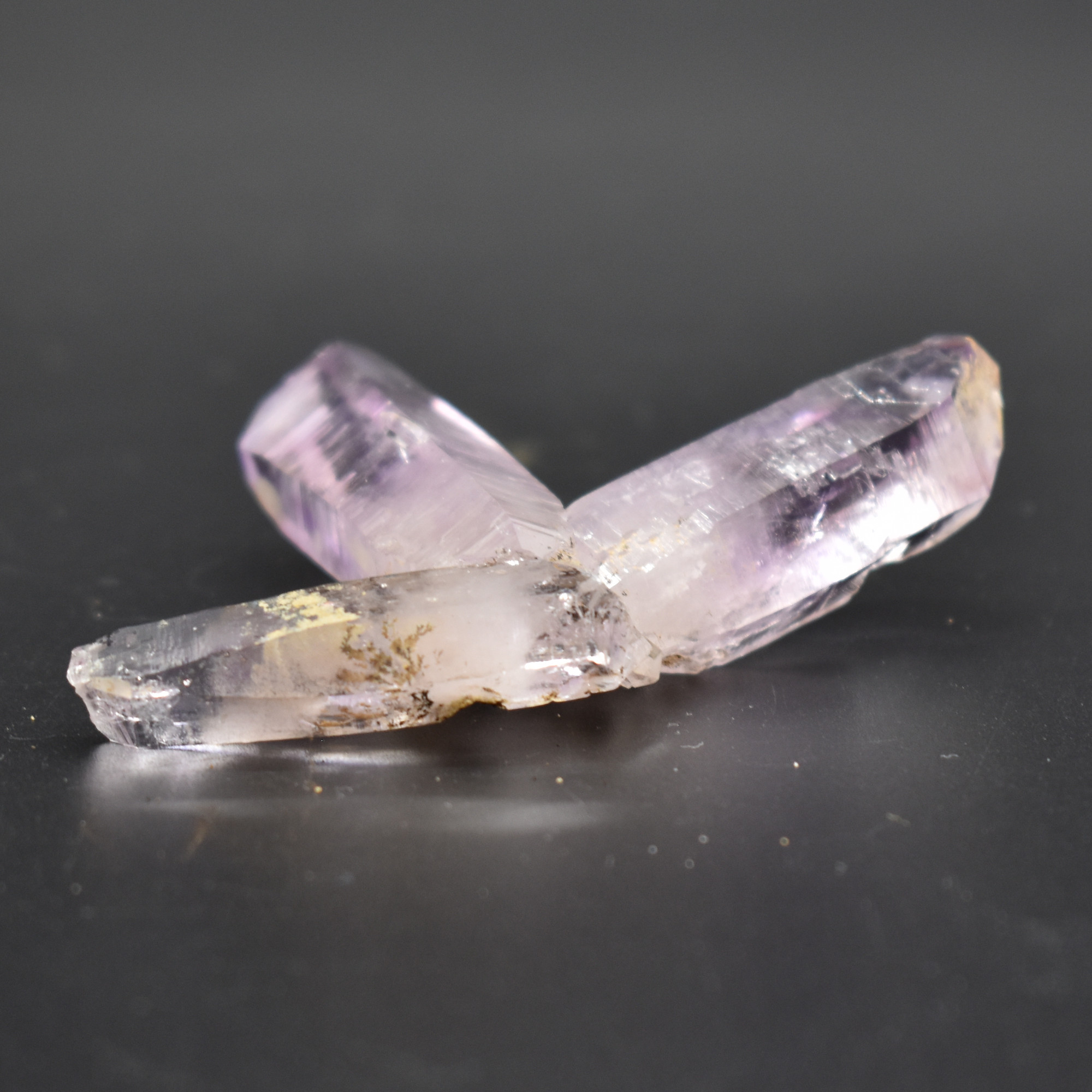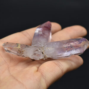 Amethyst most commonly forms in clusters or crystalline masses, however, Vera Cruz Amethyst forms as single or clustered stalactites, which are individual elongated crystal points with brilliant lustre which are often double terminated, some have scepter tips and many contain amethyst phantoms within their crystal shafts. On rare occasions, a water or gas bubble may also be present within the crystal. Graduated colouring can be seen with the darker colouring towards the top of the point while the pale, softer colours are merged into the stone.